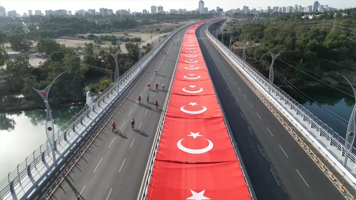 İSTANBUL (AA) – Adana 15 Temmuz Şehitler Köprüsü'nde 1699 metre uzunluğunda ve 9 metre genişliğindeki dev Türk bayrağının ve Atatürk posterinin altında Cumhuriyet'in 100. yılı kutlamaları yapıldı.
