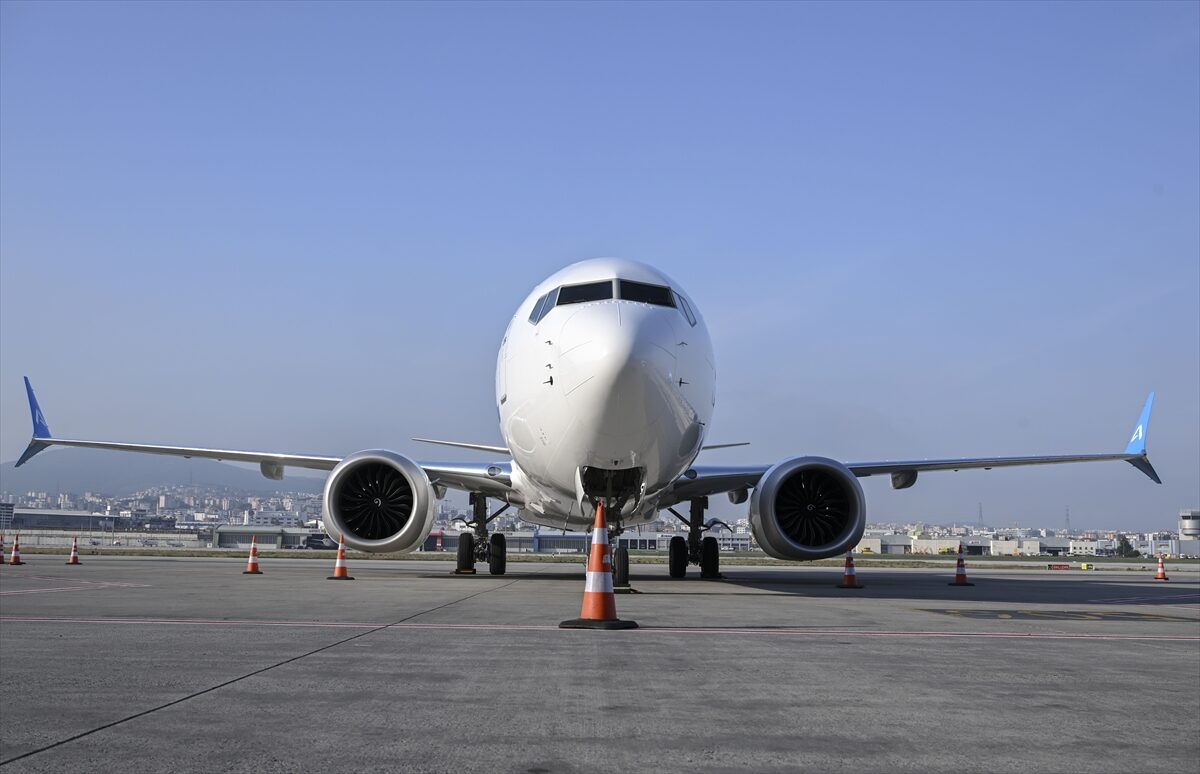 AJet’in filosuna kattığı yeni nesil fabrika çıkışlı TC-OHH tescilli 7’nci “Boeing 737-8 MAX” uçağı, Sabiha Gökçen Havalimanı’na geldi. AJet Genel Müdürü Kerem Sarp (ortada), uçak önünde basın mensuplarına açıklamalarda bulundu.