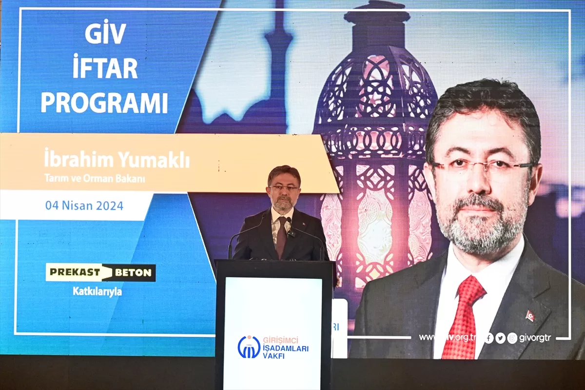 Bakan Yumaklı, Girişimci İşadamları Vakfı (GİV) tarafından Bahariye Mevlevihanesi'nde düzenlenen iftar programında yaptığı konuşmada, 2050'lerde dünya nüfusunun 10 milyar, Türkiye nüfusunun da 105 milyonu aşmış olacağına işaret ederek, daha çok gıdaya ihtiyaç duyulacağını söyledi.