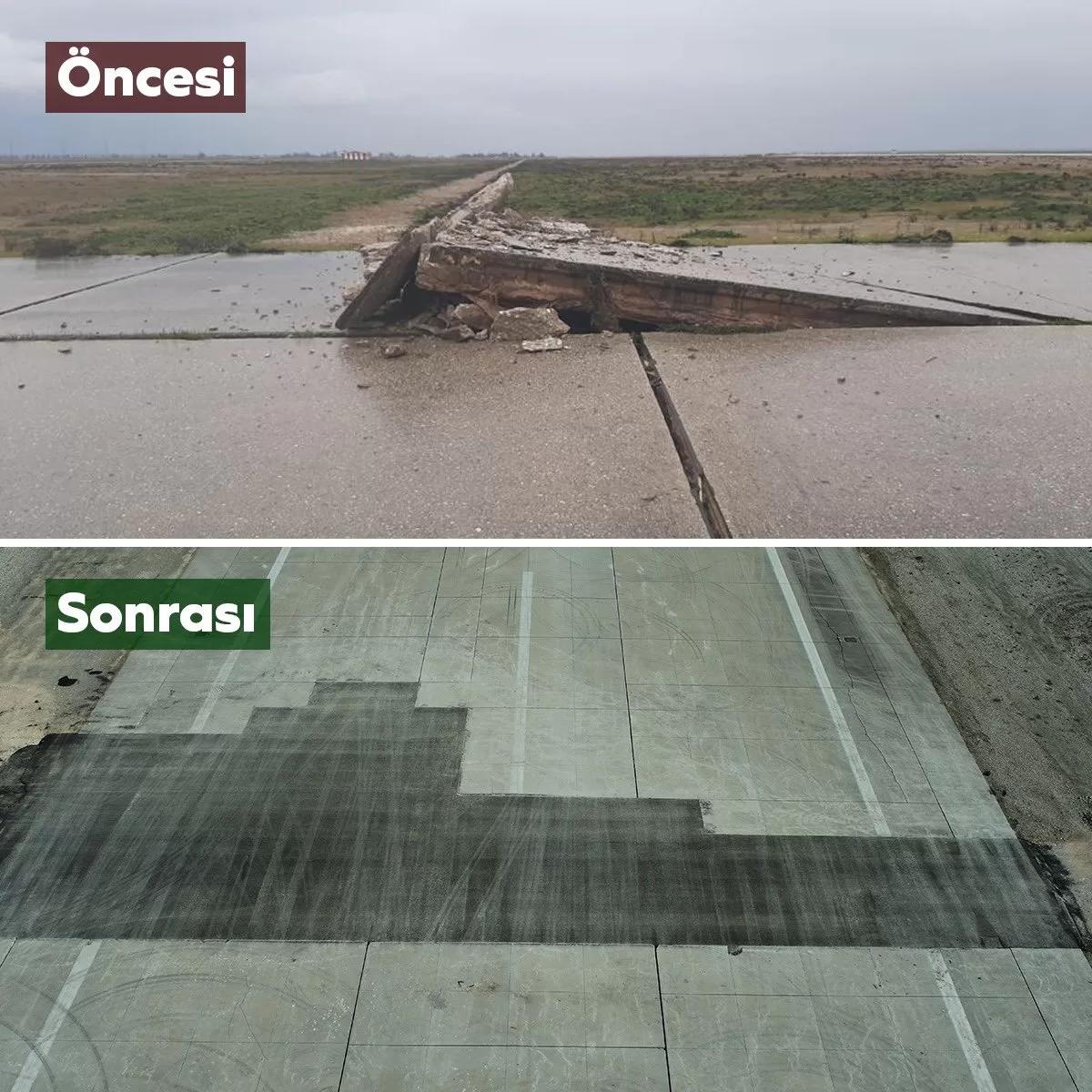Havalimanının pistinin onarım öncesi ve sonrası görsellerinin de yer aldığı paylaşımda, "Hatay Havalimanı pistindeki hasarı hızlıca onardık. Havalimanımız bugün hizmet vermeye başladı." ifadesi kullanıldı.