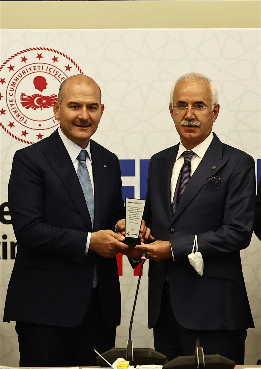 TOBB ile bağlı oda ve borsalar tarafından doğal afetler için toplanan yardımlara ilişkin çek, Afet ve Acil Durum Yönetimi Başkanlığı'nda (AFAD), İçişleri Bakanı Süleyman Soylu ve AFAD Başkanı Yunus Sezer'e takdim edildi.