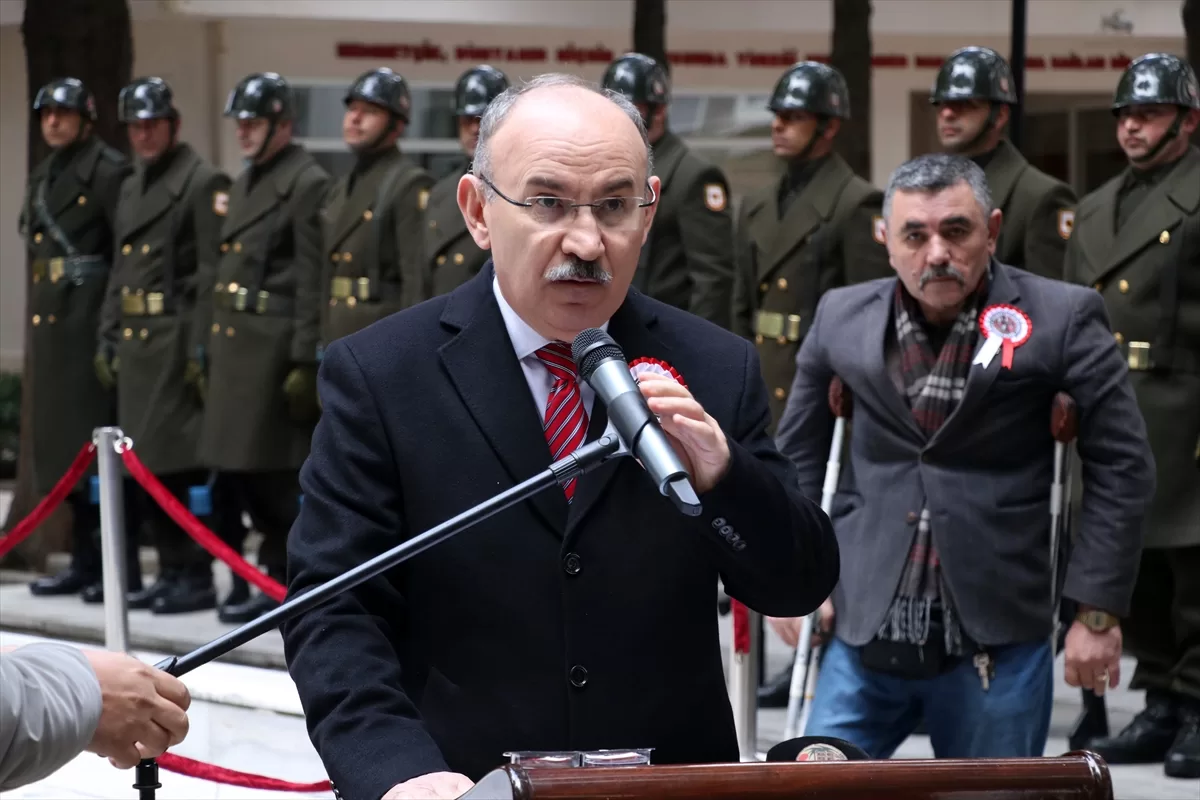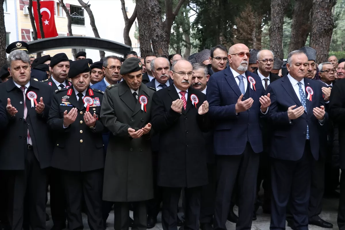Manisa'da Garnizon Şehitliği'ndeki törende, şehitlik şeref defterini imzalayan Vali Yaşar Karadeniz, vatanın bütünlüğü, milletin birliği ve dirliği için canını ortaya koymuş kahramanları rahmet ve minnetle andıklarını söyledi.