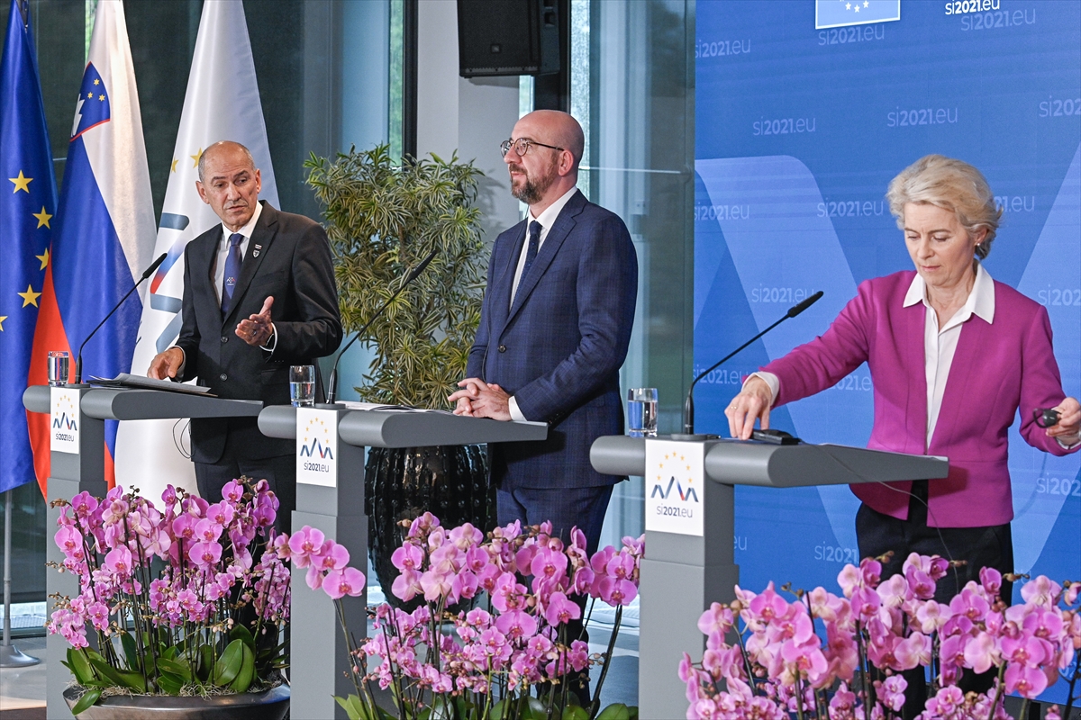Michel, AB dönem başkanı Slovenya'nın ev sahipliğinde Brdo kentinde düzenlenen AB-Batı Balkanlar Zirvesi sonrasında AB Komisyonu Başkanı Ursula von der Leyen ve Slovenya Başbakanı Janez Jansa ile ortak basın toplantısı düzenledi.