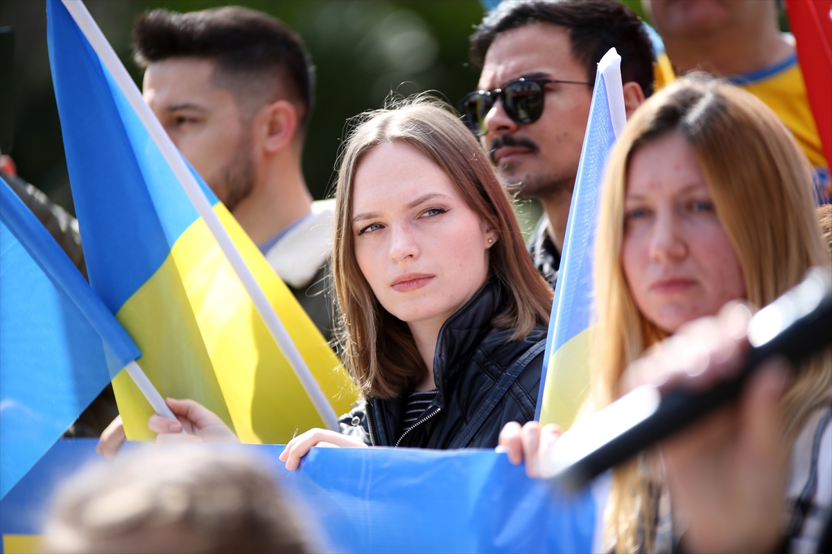Ellerinde Ukrayna bayrakları ve Rusya'ya tepki içeren yazılar bulunan dövizler taşıyan protestocular, Ukrayna'da hayatını kaybedenler için saygı duruşunda bulundu.