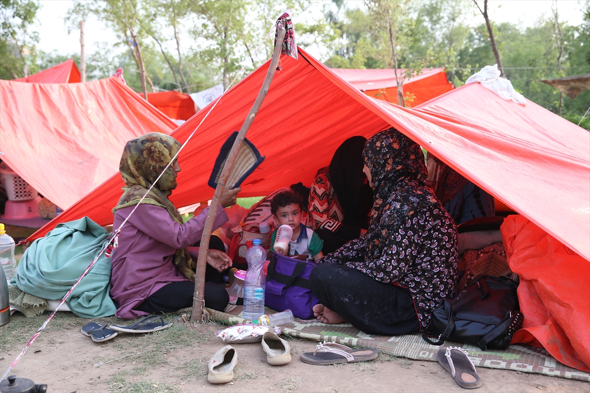 Çadırların arasında biraz yürüyünce ellerinde yelpaze olan annelerin sıcak hava altında çocuklarını serinletmeye çalıştığı görülüyor.