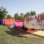 Alana girildiğinde ilk dikkati çeken şey, sığınmacıların üzerlerine giydiği ve etrafa astığı "Bizi öldür", "Çocuklarımızın hayatı değerlidir" yazılı pankartlar.