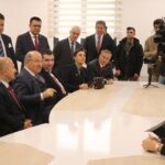 Okulda incelemelerde bulunan Varol ve beraberindekiler, öğretmenlerle sohbet etti.