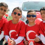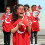 Türk bayrakları ve balonlarla süslenen 5 araçlık jandarma konvoyuyla köye giden ekipler, okulun bahçesinde ay yıldızlı tişörtler giyen öğrencilerin alkışlarıyla karşılandı.
