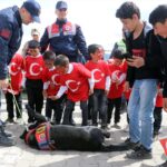 Meraklı gözlerle gösteriyi beğeniyle izleyen çocuklar, daha sonra başını okşadıkları köpekleri sevip fotoğraf çekildi.