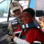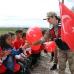 Çocuklara Türk bayrağı ve balon hediye eden jandarma ekipleri, onlarla yakından ilgilenip yüzlerini çeşitli renklere boyadı.