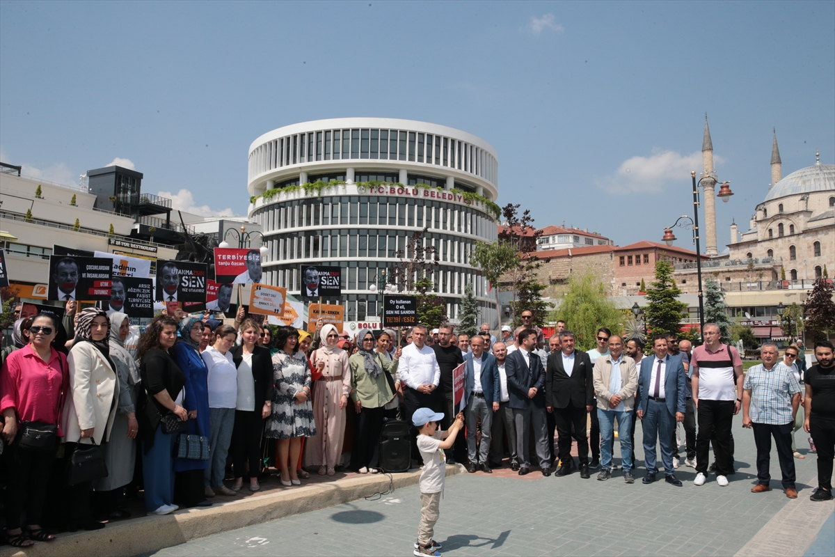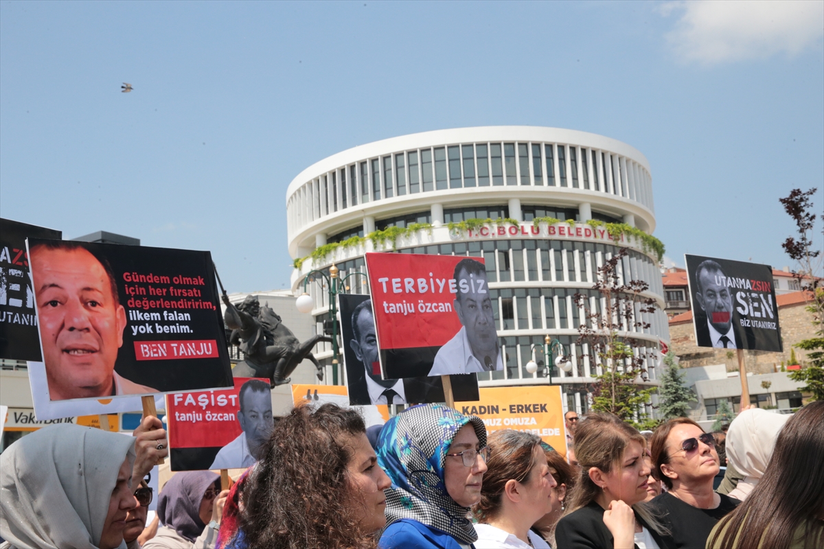 Ellerinde "Utanmazsın sen biz utanırız", "Kadının iffeti kutsaldır", "Terbiyesiz Tanju Özcan", "Kadına şiddet insanlığa ihanet", "İffetsizlikle iffet savunulmaz" gibi yazıların bulunduğu dövizler taşıyan kadınlar ile parti üyeleri, Bolu Belediyesi önünde basın açıklaması yaptı.