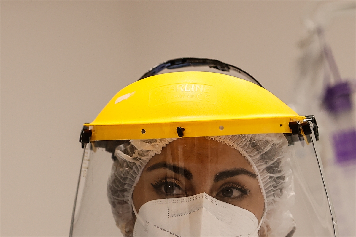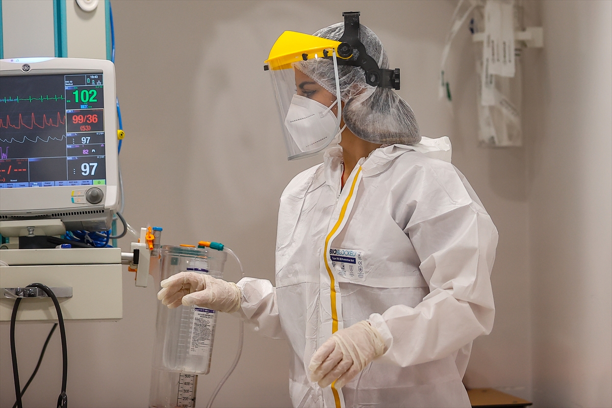 Akdeniz Üniversitesi Hastanesinin Kovid-19 hastalarının tedavi edildiği serviste ve yoğun bakım ünitesinde tulum, önlük, maske, gözlük ve siperlikle görev yapan sağlıkçılar, hastaların durumunu titizlikle takip ediyor.