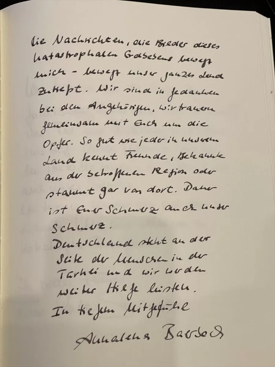 Baerbock taziye defterine, "Bu feci depremin haberleri, görüntüleri beni ve ülkemizin dört bir yanını derinden etkiledi. Hayatını kaybedenlerin yakınlarıyla birlikte, vefat edenlerin yasını sizlerle birlikte tutuyoruz. Ülkemizde hemen herkesin etkilenen bölgeden tanıdıkları, arkadaşları var, hatta oradan geliyorlar. Dolayısıyla sizin acınız bizim de acımızdır. Almanya olarak Türkiye'deki insanların yanındayız ve yardım etmeye devam edeceğiz." ifadelerini yazdı.