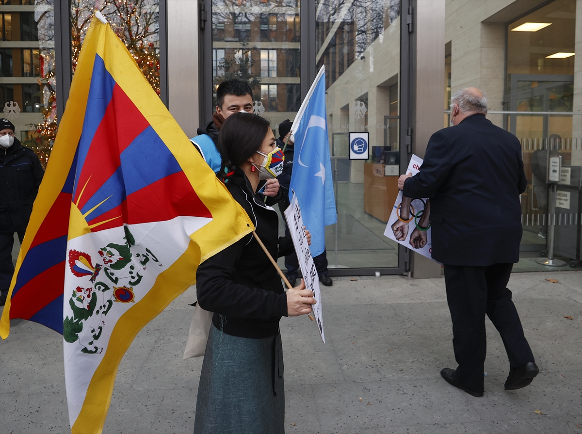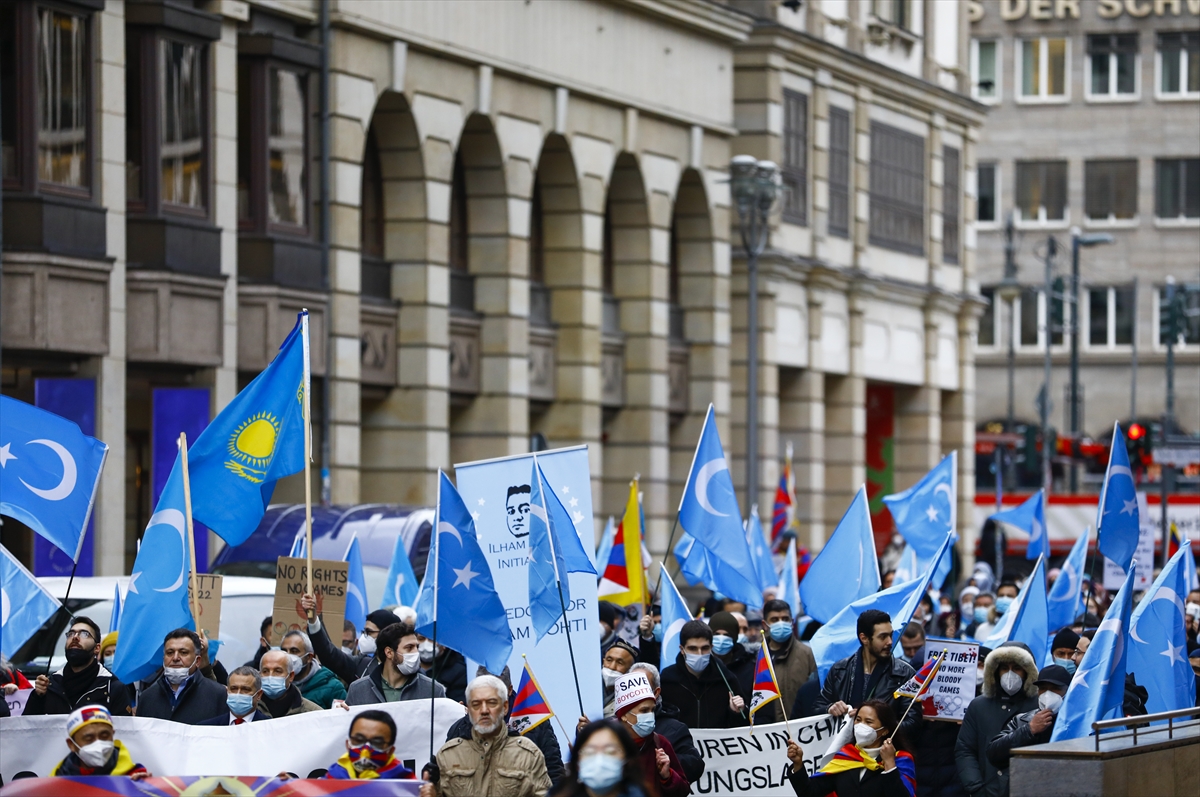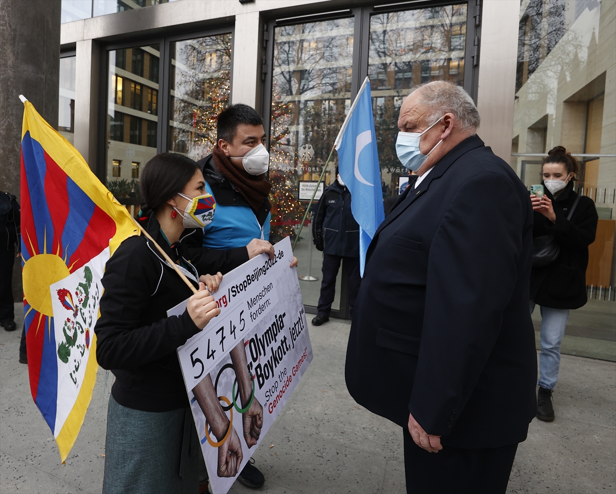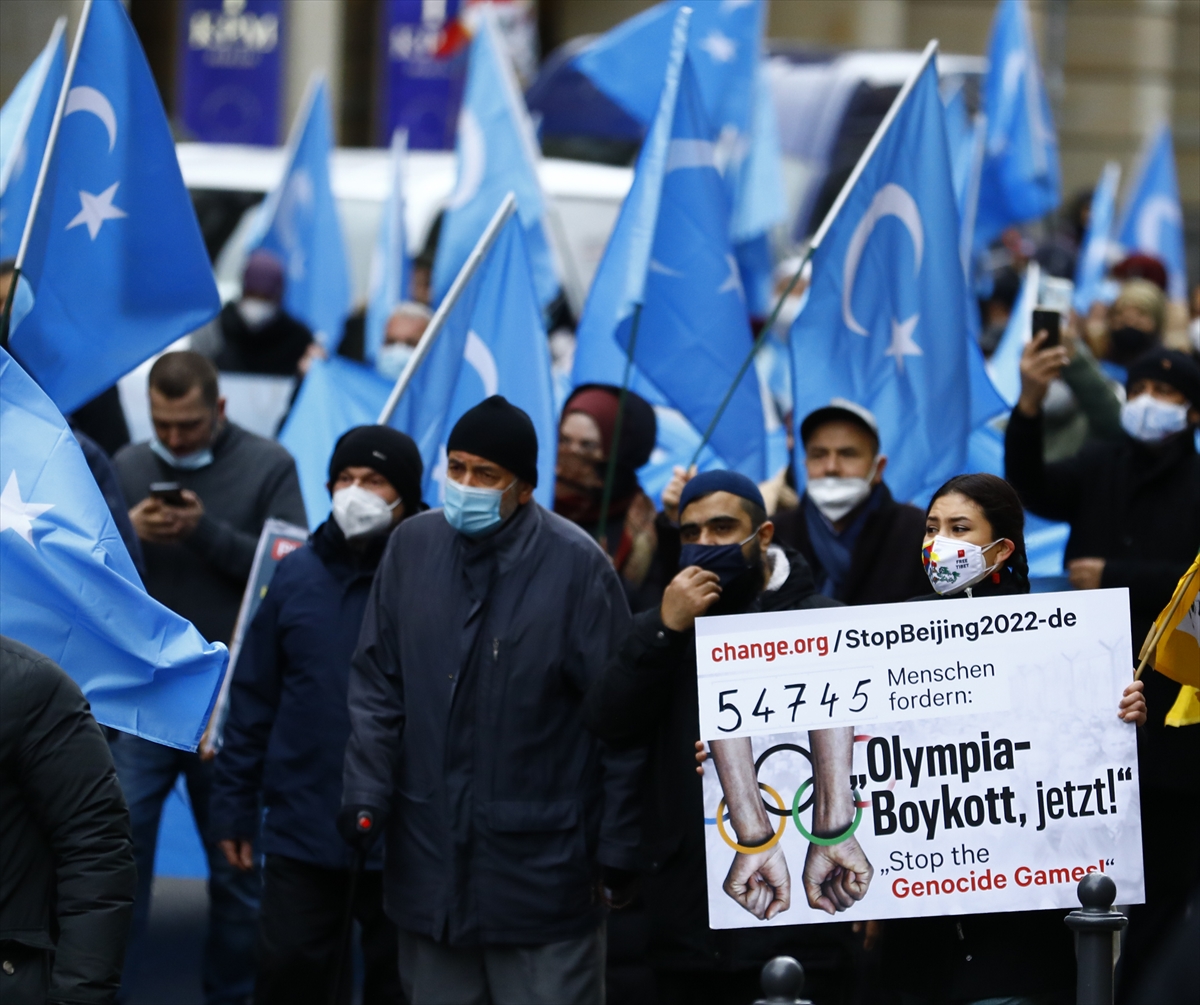 Dünya Uygur Kongresinin çağrısıyla başkent Berlin’deki tarihi Brandenburg Kapısı önünde Pekin Kış Olimpiyat Oyunları'nın boykot edilmesi için toplanan yüzlerce kişi daha sonra Unter den Linden ve Französische caddeleri üzerinden Almanya Dışişleri Bakanlığına kadar yürüdü.