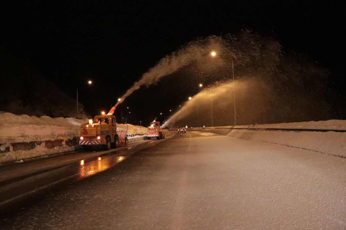 Kar küreme araçları ile greyderler ise püskürtme sırasında yolda kalan karları temizleyerek yolda tuzlama çalışması yürütüyor.