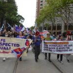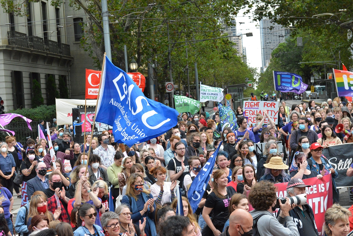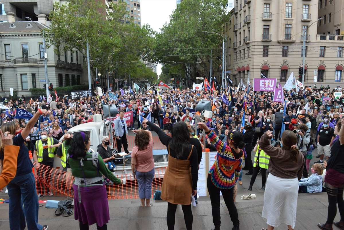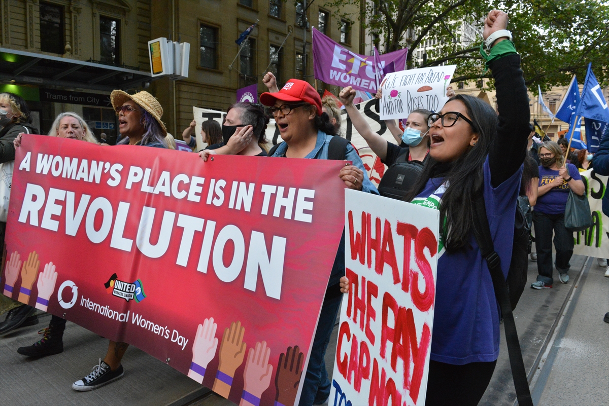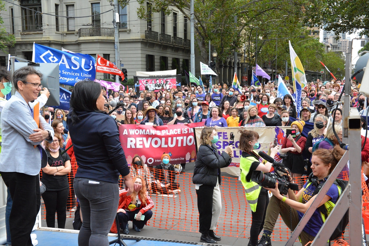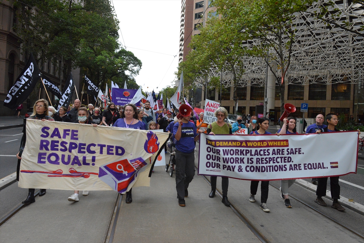 Çeşitli sendikalar tarafından 8 Mart Dünya Kadınlar Günü dolayısıyla Melbourne kent merkezindeki eski Hazine Bakanlığı binası önünde düzenlenen gösteriye çoğunluğu kadınlardan oluşan yüzlerce kişi katıldı.