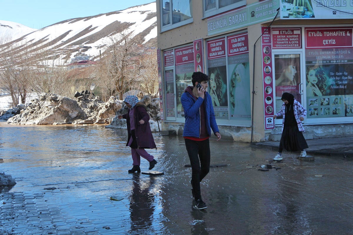 Turgut Özal Mahallesi'nde bazı yollar, eriyen kar nedeniyle suyla kaplandı.