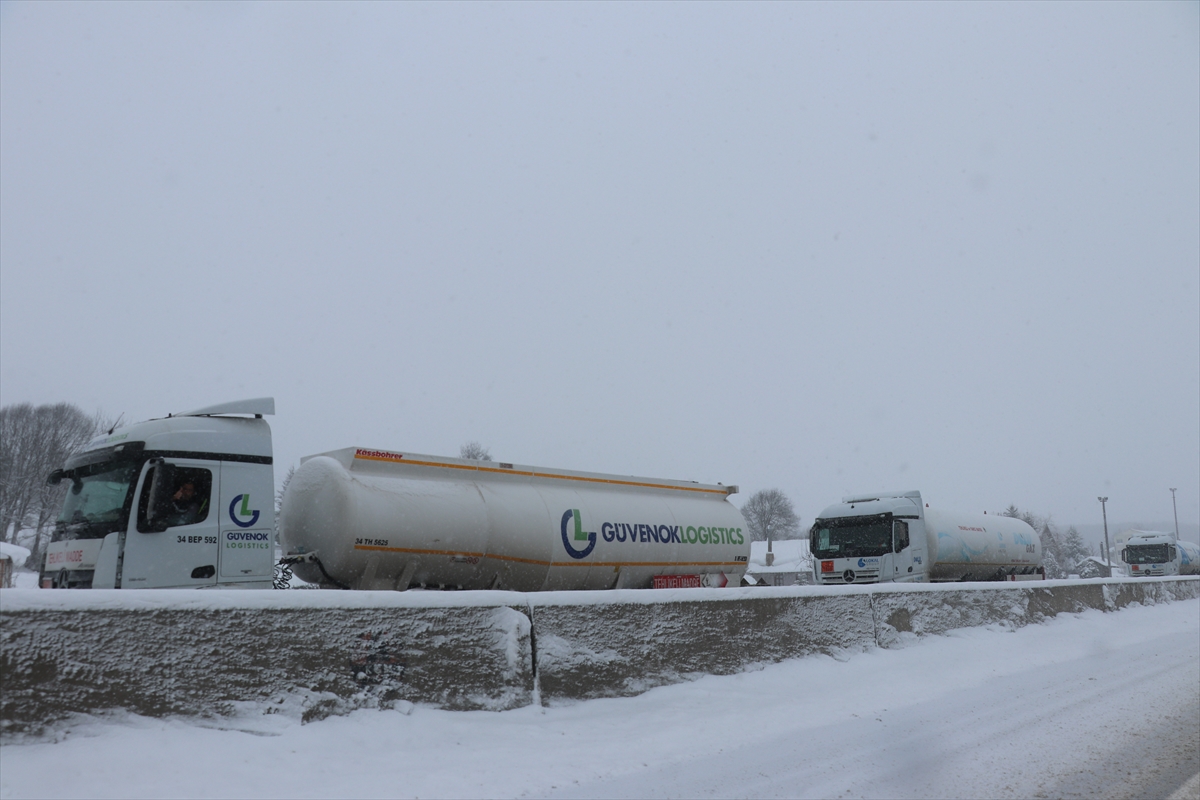BOLU (AA) – D-100 kara yolunun Bolu Dağı kesimi İstanbul yönünde, yoğun kar yağışı ve buzlanma nedeniyle yolun ulaşıma kapanmaması için tırların geçişine izin verilmiyor.