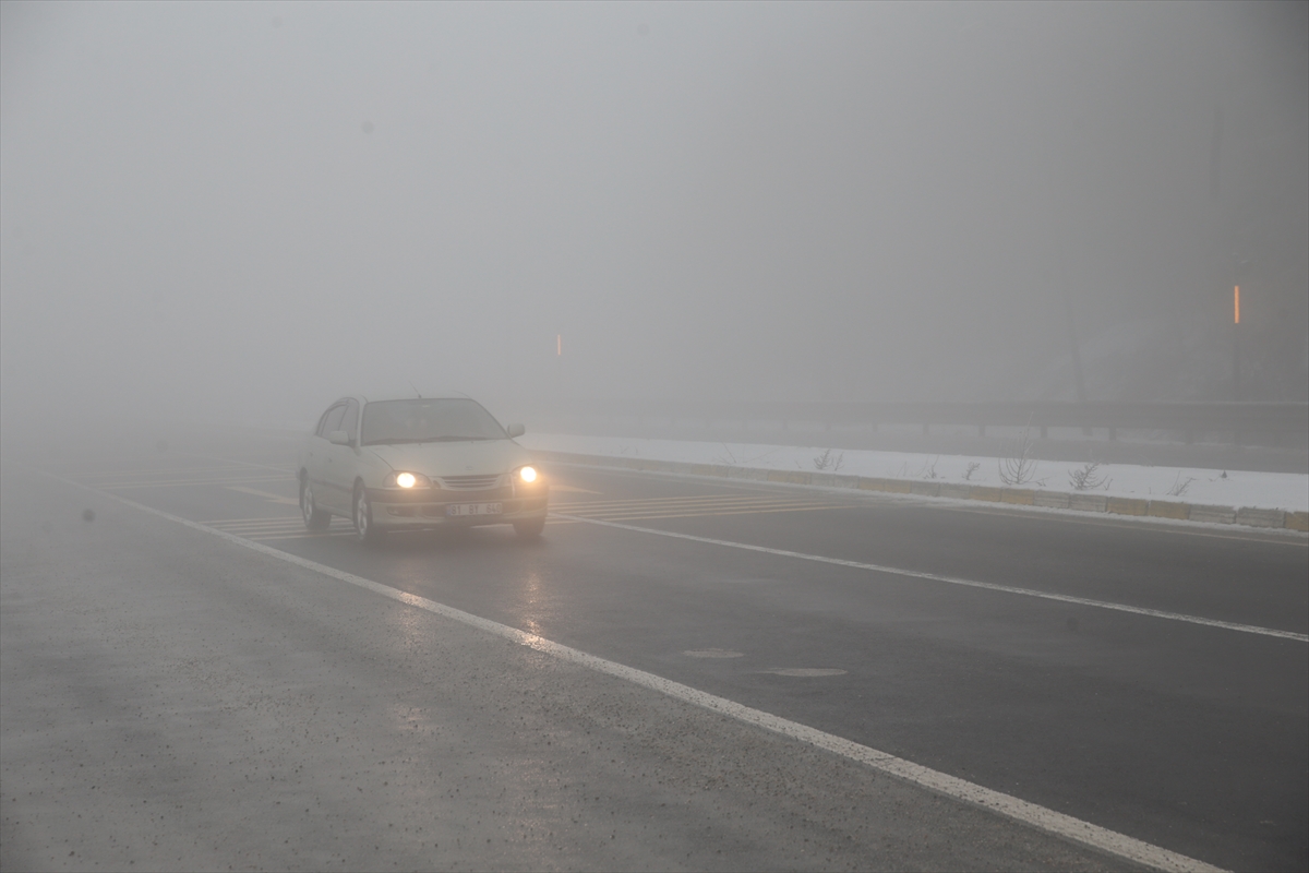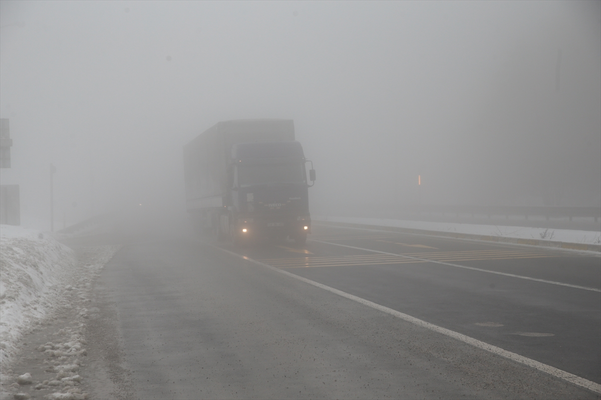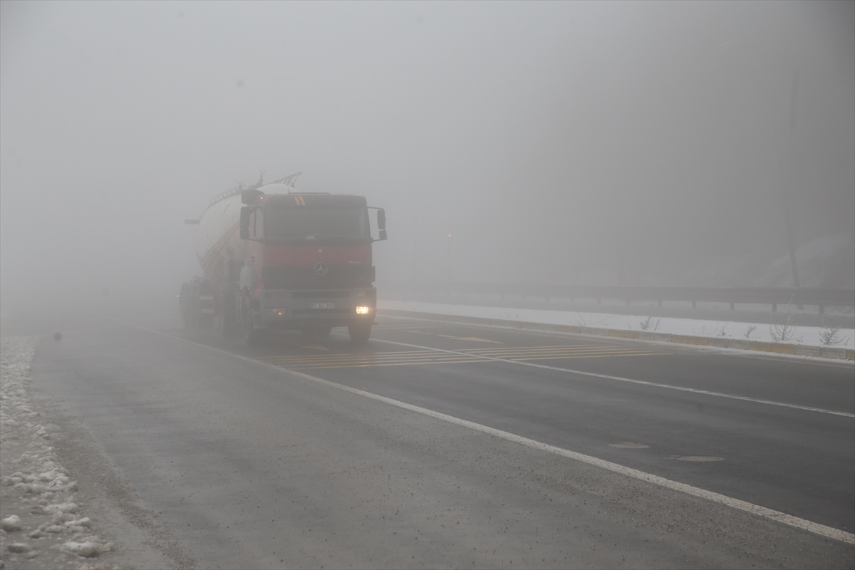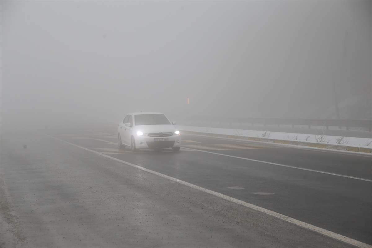 BOLU (AA) – D-100 kara yolunun Bolu Dağı kesiminde hafif kar yağışı ve sis etkisini gösteriyor.
