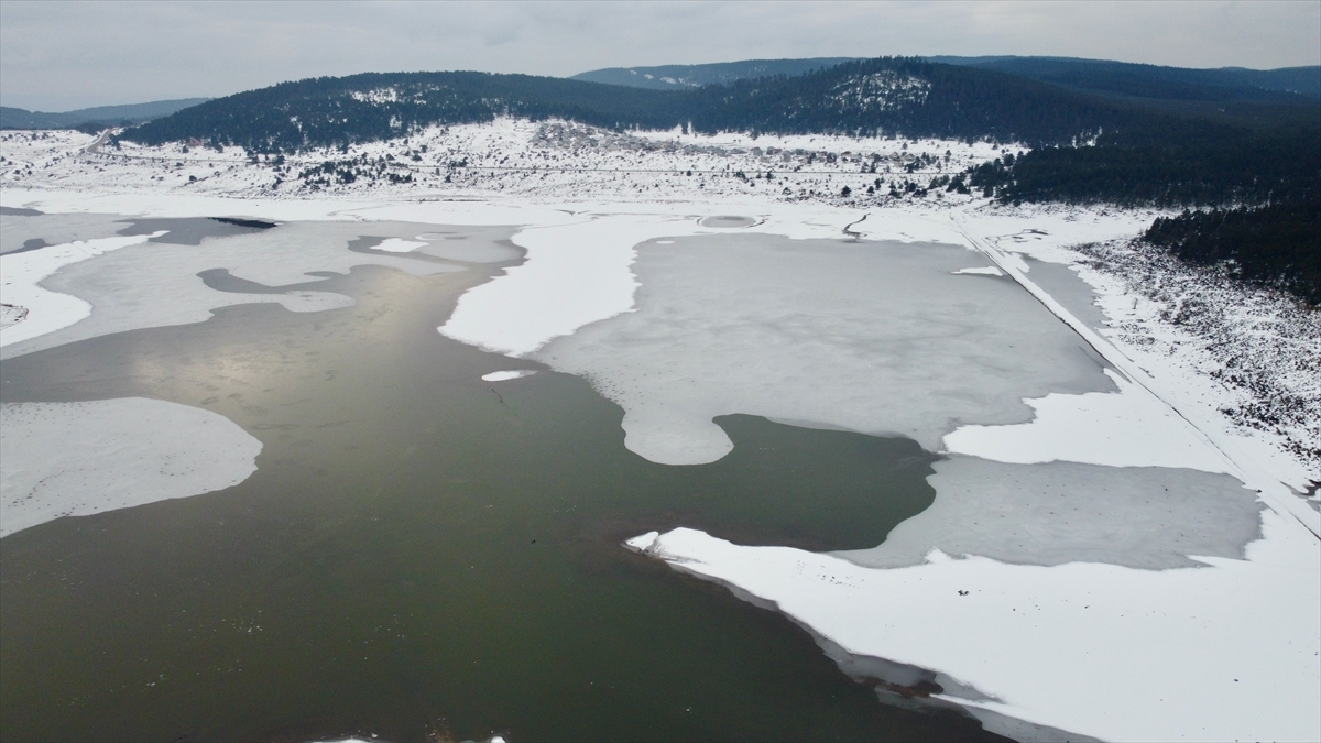 Etkili olan soğuk havanın etkisiyle yer yer buzla kaplanan göl, dronla görüntülendi.