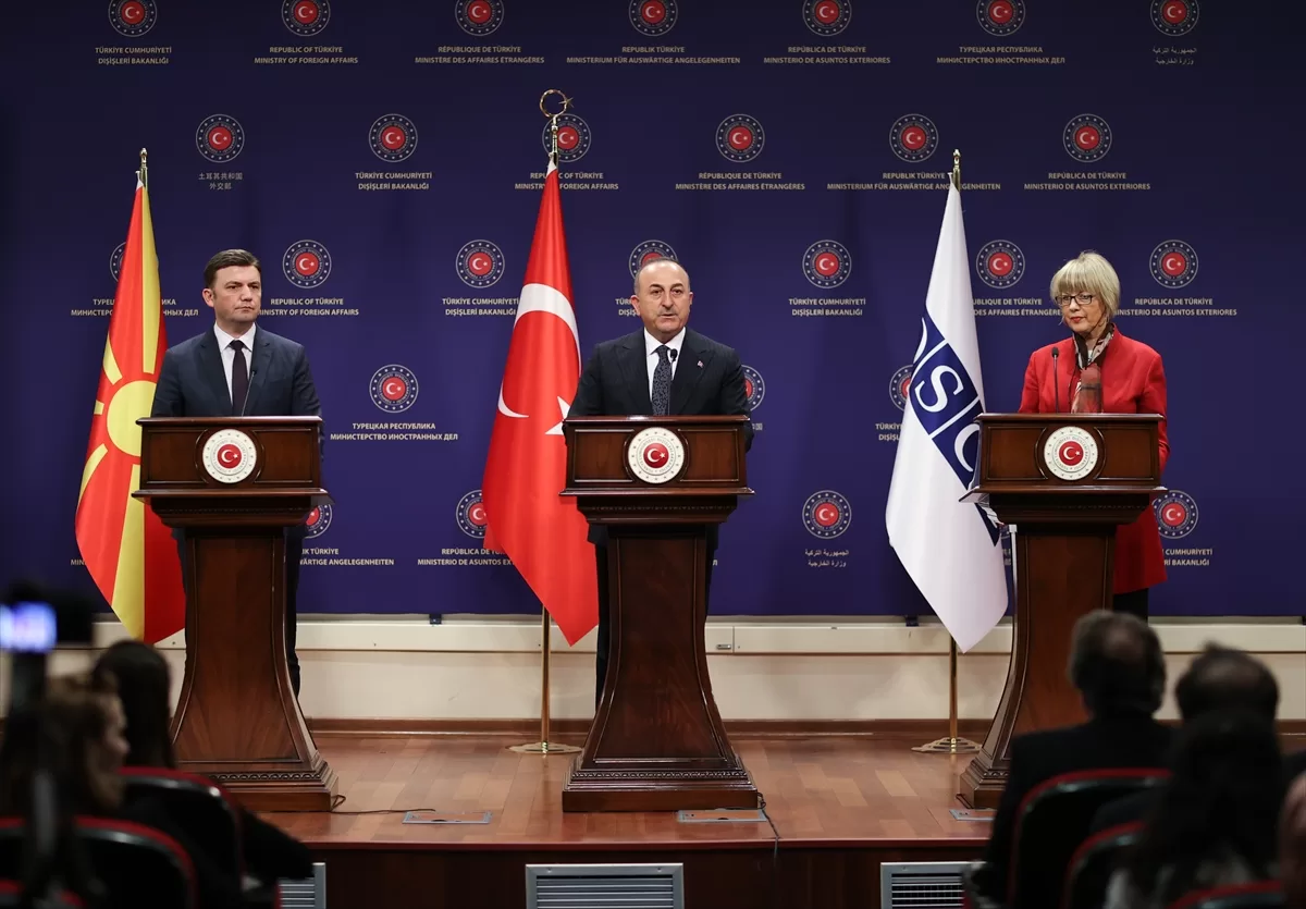 Çavuşoğlu, Kuzey Makedonya Dışişleri Bakanı ve Avrupa Güvenlik ve İşbirliği Teşkilatı (AGİT) Dönem Başkanı Bujar Osmani ve AGİT Genel Sekreteri Helga Schmid ile Dışişleri Bakanlığı'ndaki görüşmelerinin ardından düzenlenen ortak basın toplantısında konuştu.