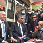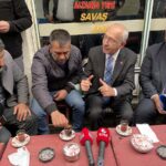 Ortakapı Mahallesi Kasaplar Hali Sokak'taki esnafı ziyaret eden Kılıçdaroğlu, buradaki bir çay ocağında vatandaşlarla oturup çay içti.