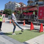 Eğitim kapsamında vatandaşlar, ortalama 100 promil alkollü hissi veren "alkol gözlüğü" takarak penaltı atışları yaptı.
