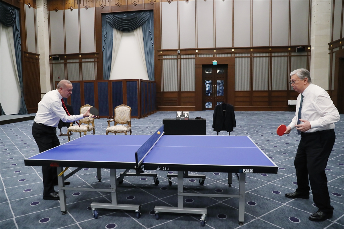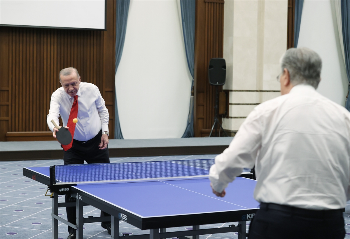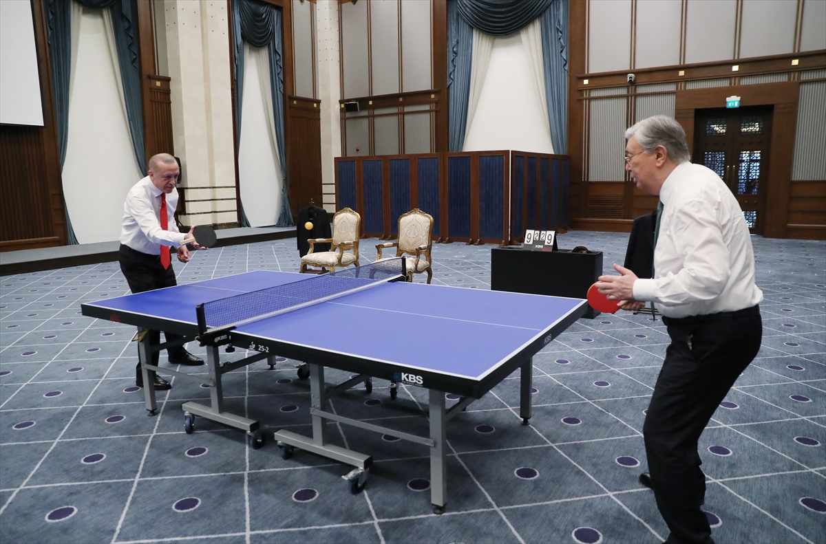 Cumhurbaşkanı Erdoğan, Türkiye'ye resmi ziyarette bulunan Kazakistan Cumhurbaşkanı Tokayev ile Cumhurbaşkanlığı Külliyesinde düzenlenen anlaşmaların imza töreninin ardından bir süre masa tenisi oynadı.
