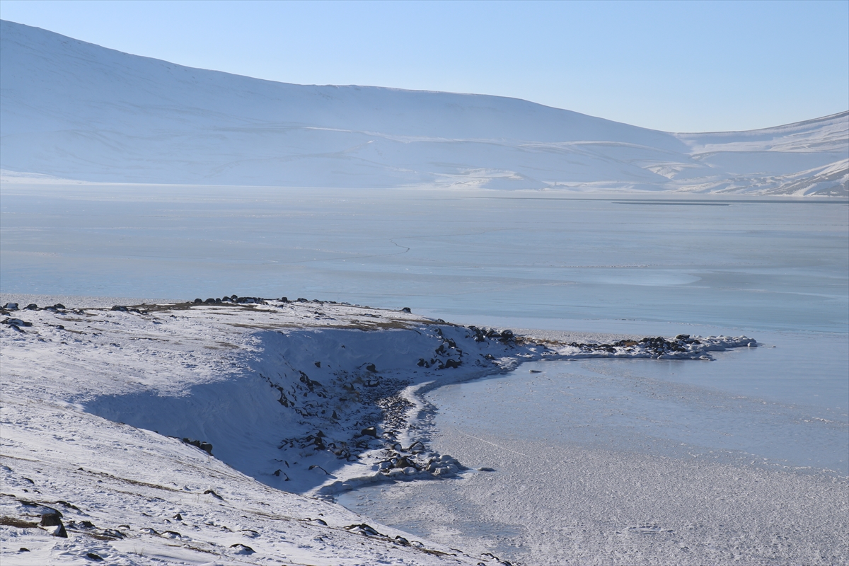 AĞRI (AA) – ABDULLAH SÖYLEMEZ – Ağrı'da her mevsim çok sayıda ziyaretçiyi ağırlayan Balık Gölü, bölgede etkili olan dondurucu soğukların etkisiyle buzla kaplandı.