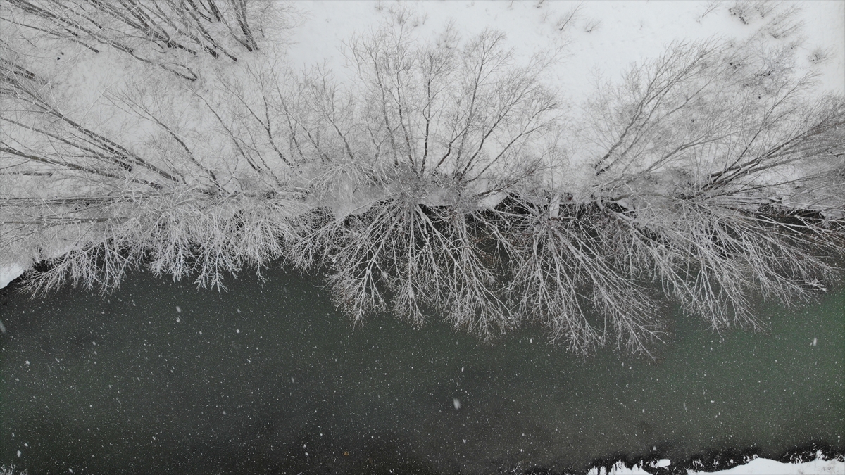 Nehrin kenarında beyaz örtüyle kaplanan alanların oluşturduğu manzara drone ile de görüntülendi.