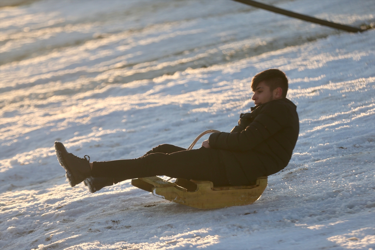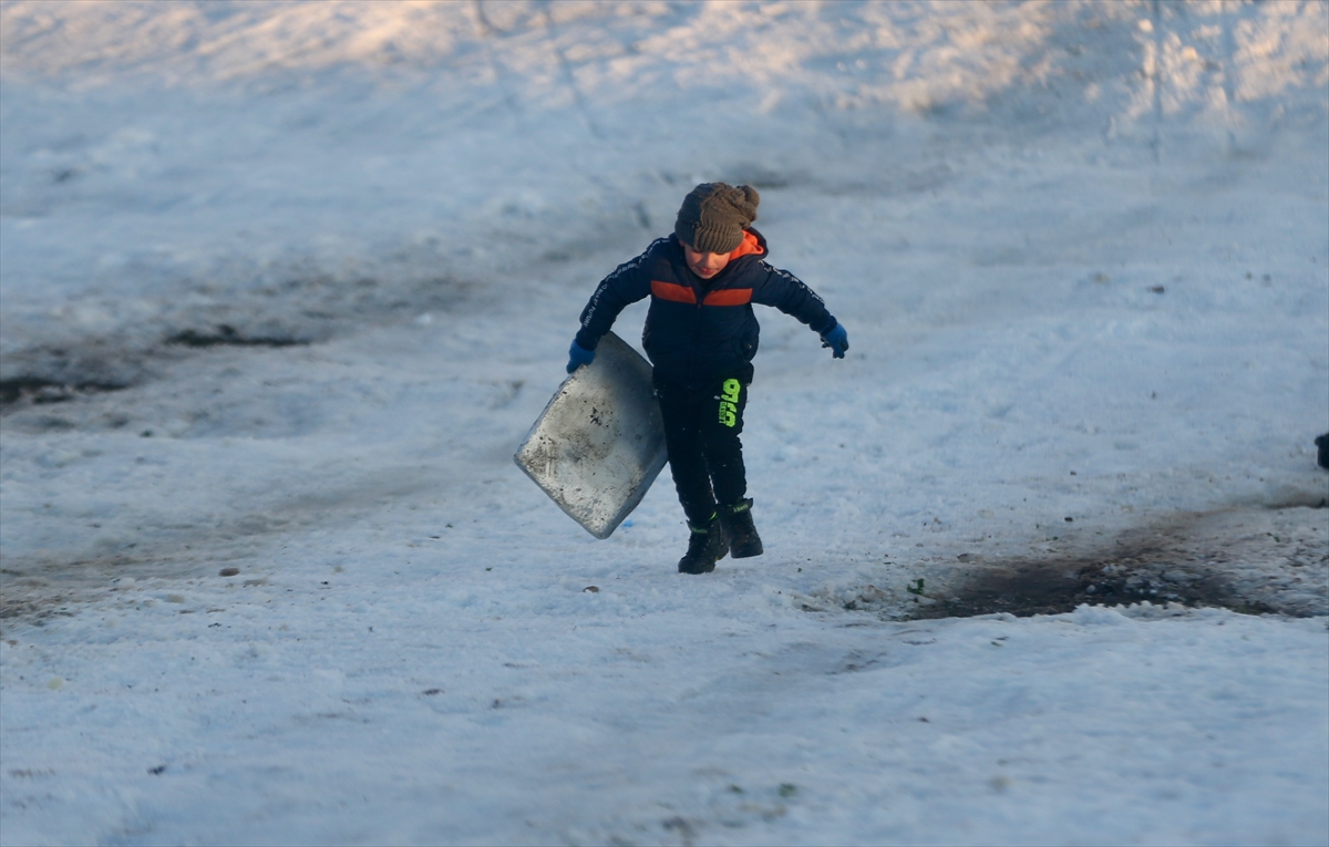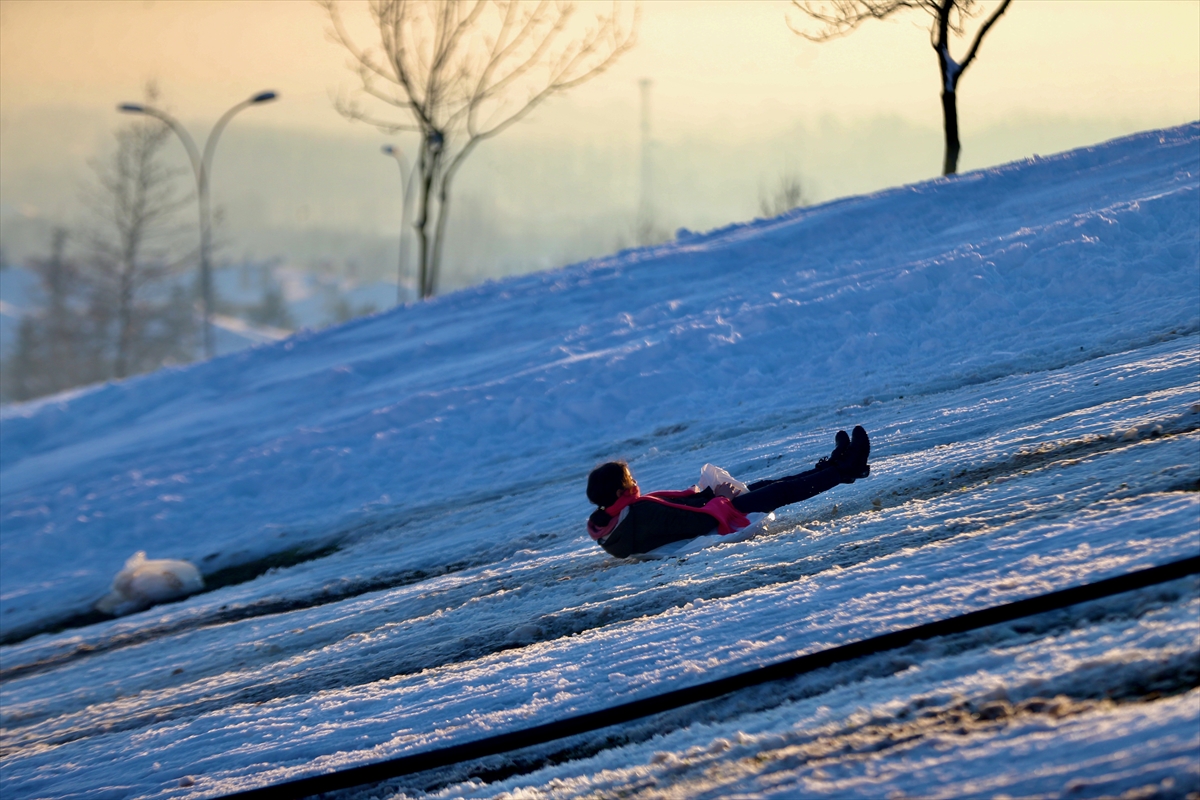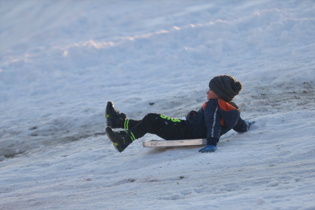 Okullarından karnelerini alarak yarıyıl tatiline giren çocuklar, kızakların yanı sıra poşet, tepsi ve leğen gibi malzemelerle parktaki eğilimli araziye geldi. Kendilerini sırasıyla yokuş aşağı bırakan çocuklar, karda eğlenceli vakit geçirdi.