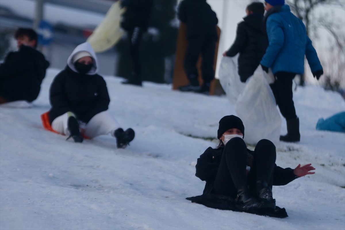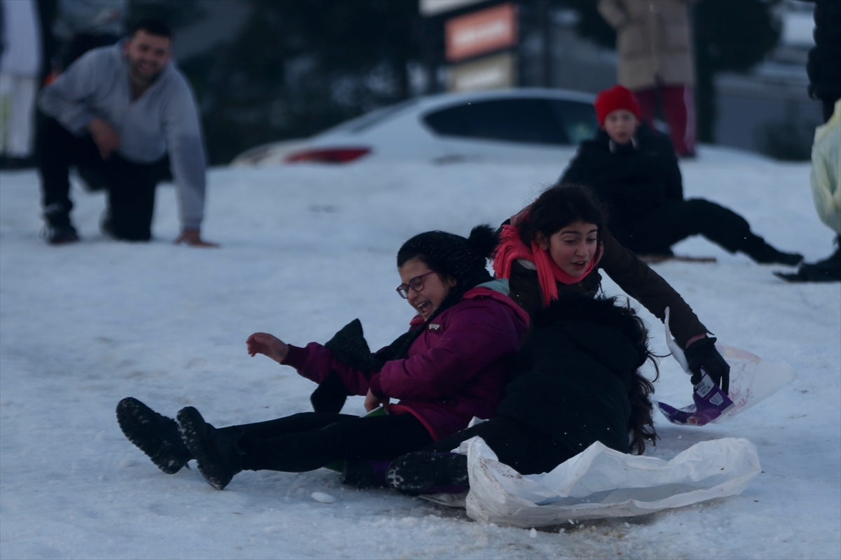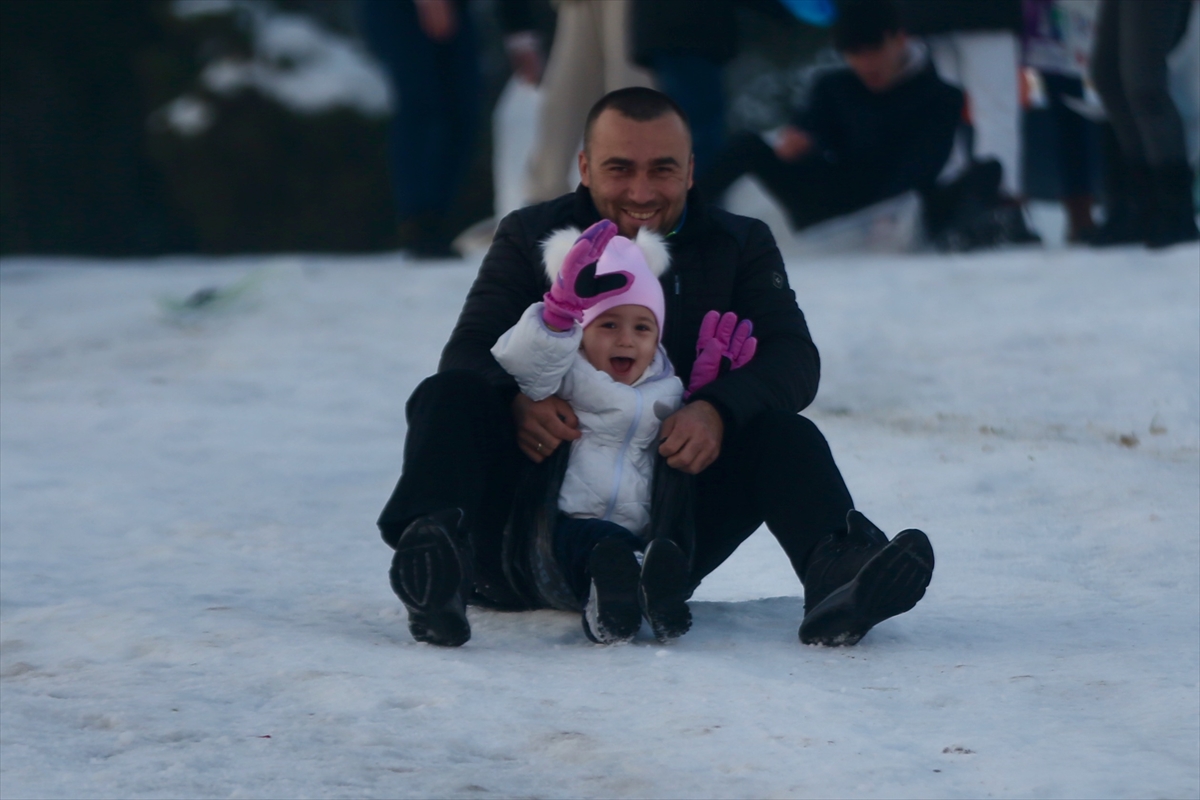 Okullarından karnelerini alarak yarıyıl tatiline giren çocuklar, kızakların yanı sıra poşet, tepsi ve leğen gibi malzemelerle parktaki eğilimli araziye geldi. Kendilerini sırasıyla yokuş aşağı bırakan çocuklar, karda eğlenceli vakit geçirdi.
