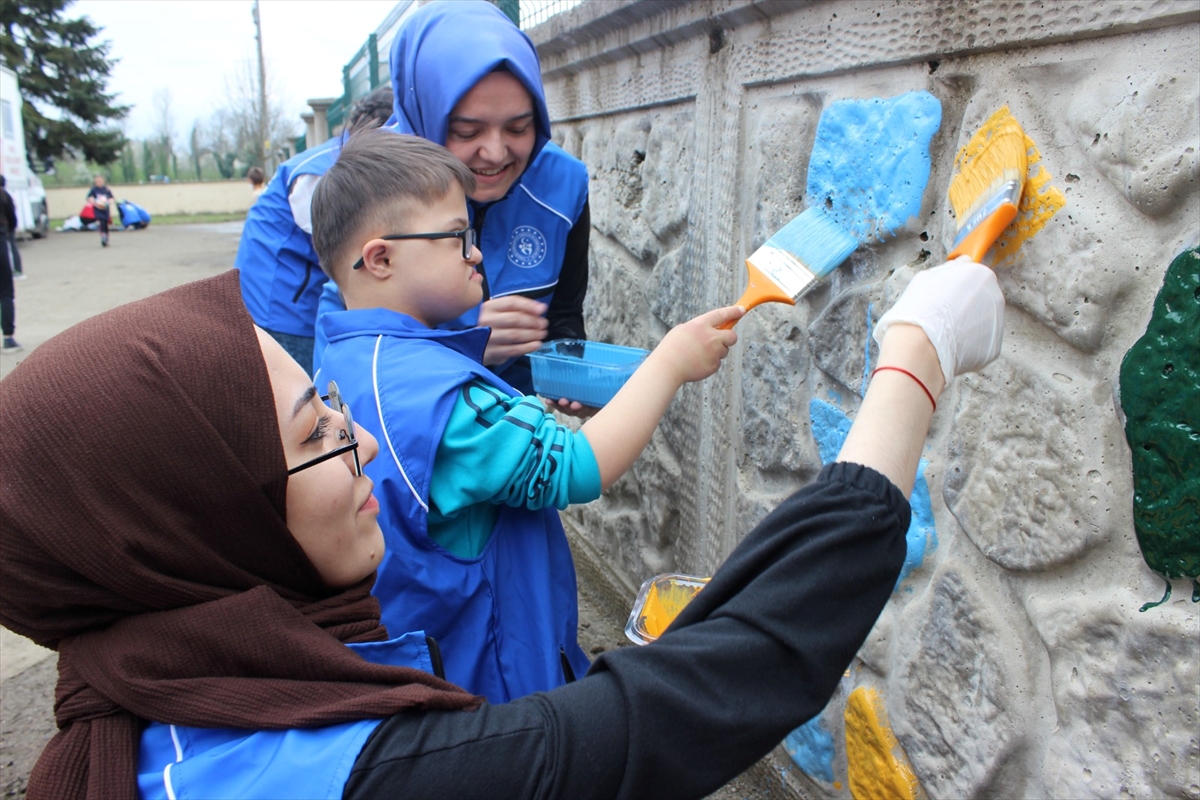 Roman vatandaşların yoğun olarak yaşadığı Çam Köy Mahallesi'ndeki ilköğretim okuluna giden gençler, yanlarında getirdikleri boya ve fırçalarla okulun dış cephesini çevreleyen duvarı çocuklarla birlikte rengarenk boyadı.