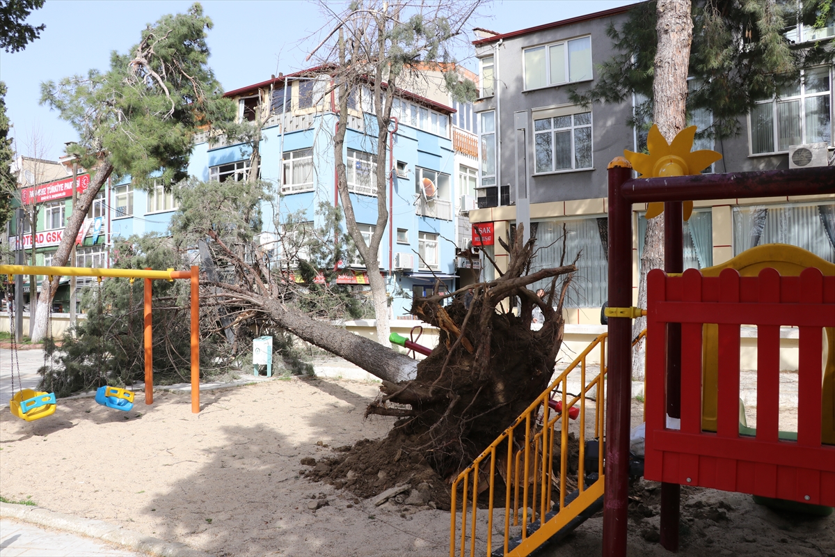 Fırtına nedeniyle Balıkpazarı Caddesi'nde Polis Parkı içerisindeki çocuk oyun grubunun bulunduğu alana büyük bir ağaç devrildi.