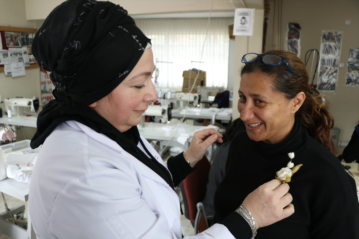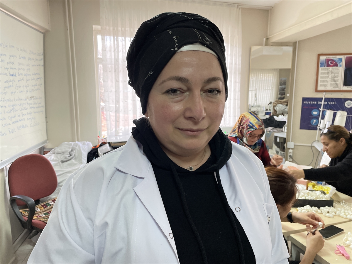 Kadınların üretmeye devam ettiğini belirten Bilgiç, "Konfeksiyon ve el emeği ürünler atölyesinde çalışmalarımızı sürdürüyoruz. El emeği ürünleri atölyesinde hediyelik eşya ürünleri yapıyoruz. Bu ipek böceği kozasından aksesuar olarak kullanılan yaka iğnesi süsü yapıyoruz." diye konuştu.