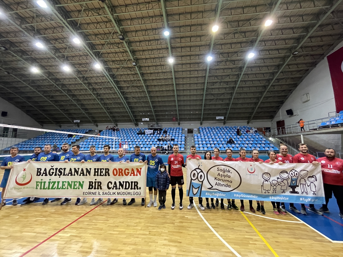 EDİRNE (AA) – Edirne'de düzenlenen kurumlar arası voleybol müsabakasında sporcular sahaya aşı ve organ bağışı mesajı içeren pankartlarla çıktı.