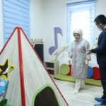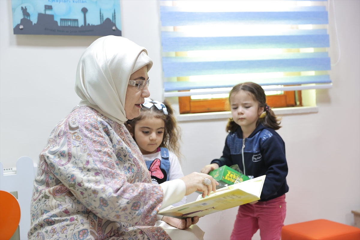 Ardından kütüphaneyi gezerek yetkililerden bilgi alan Emine Erdoğan, burada oynayan bebek ve çocukları sevip onlara oyuncak hediye etti.