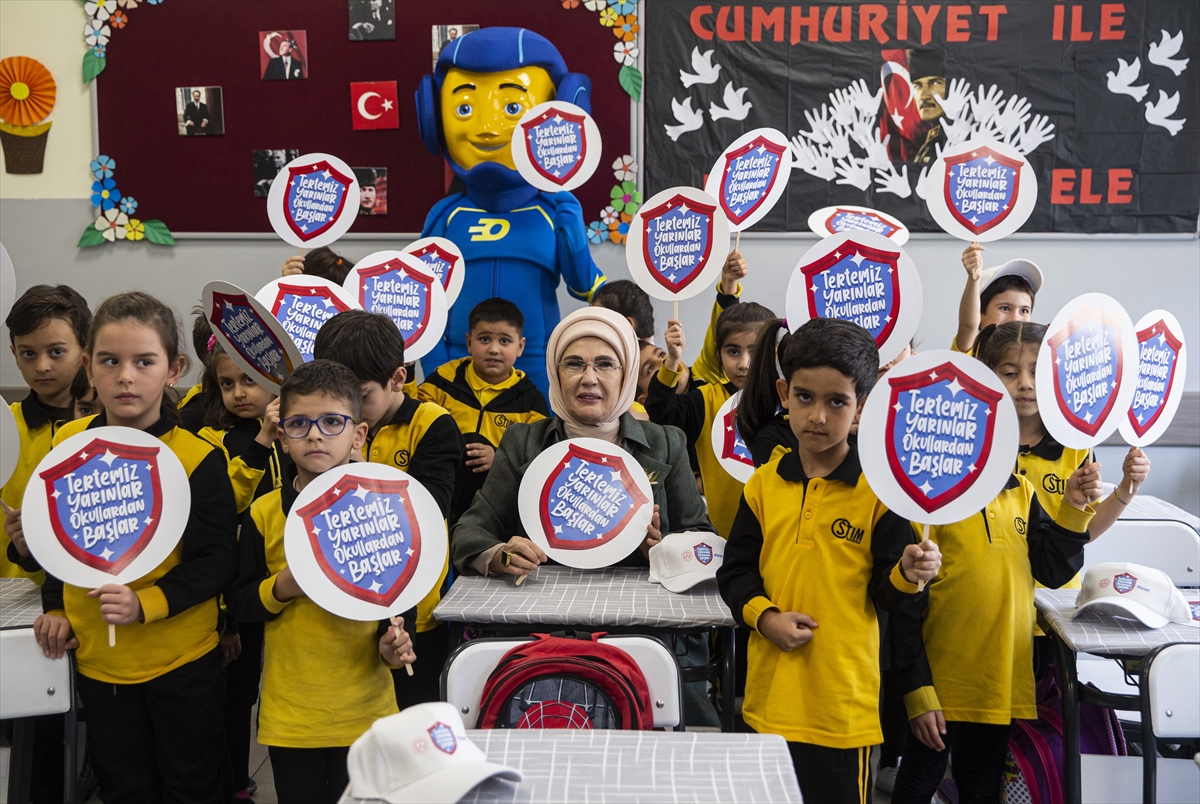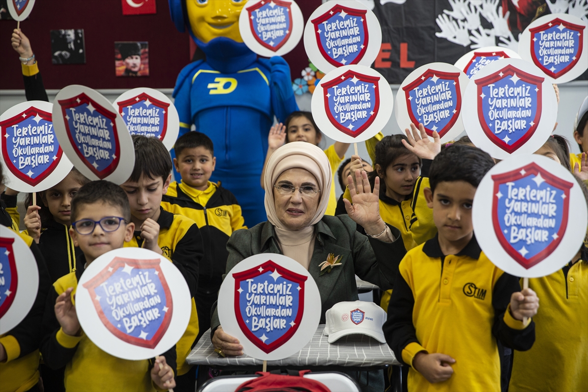 İlkokul 1. sınıfta verilen "hijyen eğitimi" dersine konuk olan Emine Erdoğan, hijyen konusunda sohbet ettiği öğrencilere kitap ve boyama malzemeleri hediye etti.