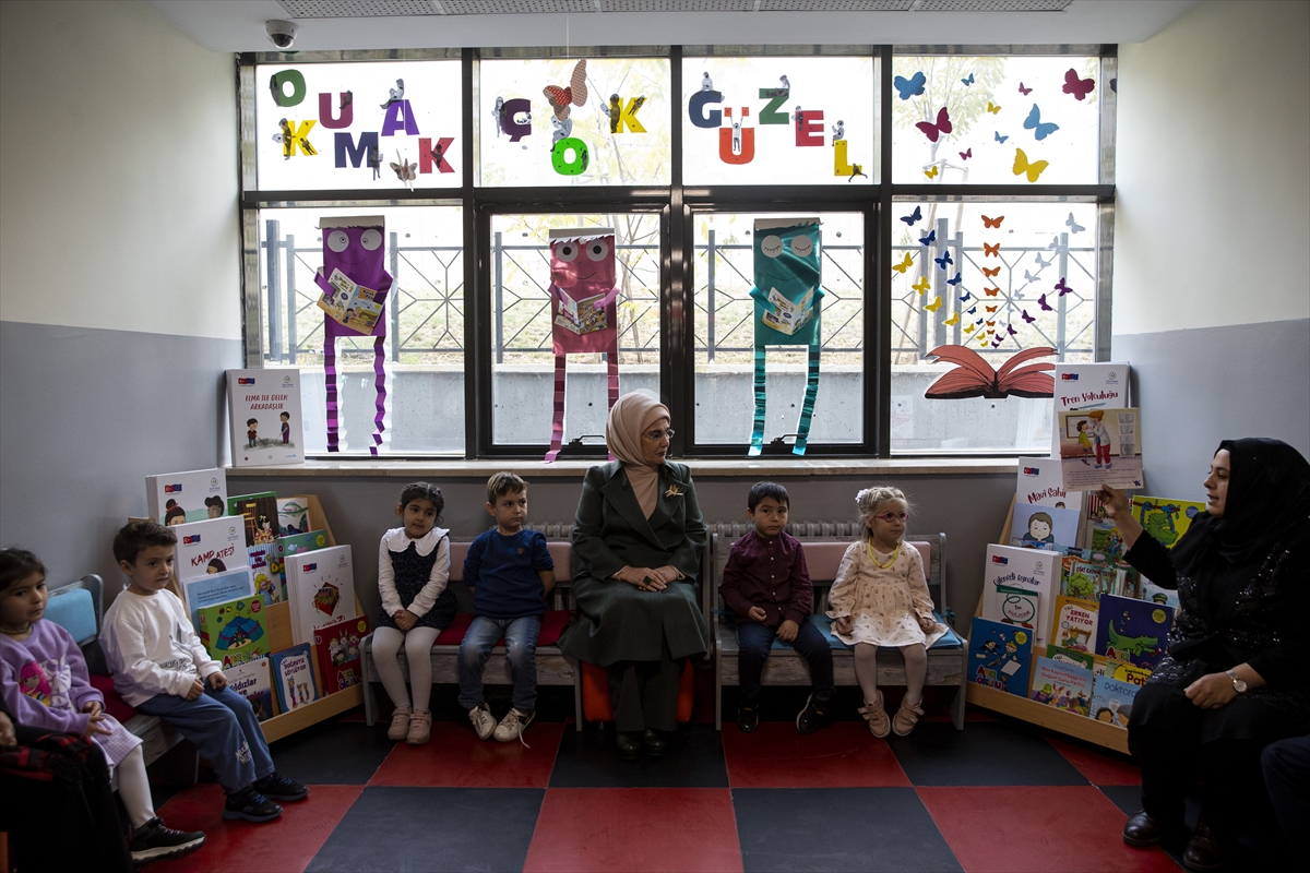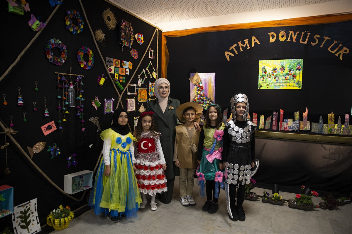 Anasınıfı öğrencilerinin "Sıfır Atık" ürünleri ile ilgili bilgi alan Emine Erdoğan daha sonra okulun Masal Anlatım Bölümü'nde öğrencilerle ve öğretmenlerle sohbet etti.