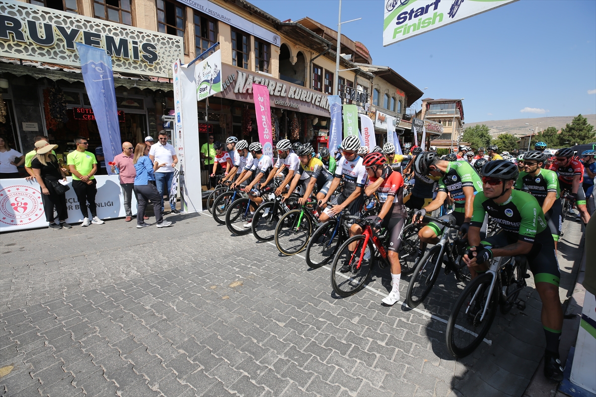 Nevşehir'in Ürgüp ilçesindeki Cumhuriyet Meydanı'nın başlangıç çizgisinde bir araya gelen bisikletçiler, Ürgüp Belediye Başkanı Mehmet Aktürk'ün verdiği startla yarışa başladı.