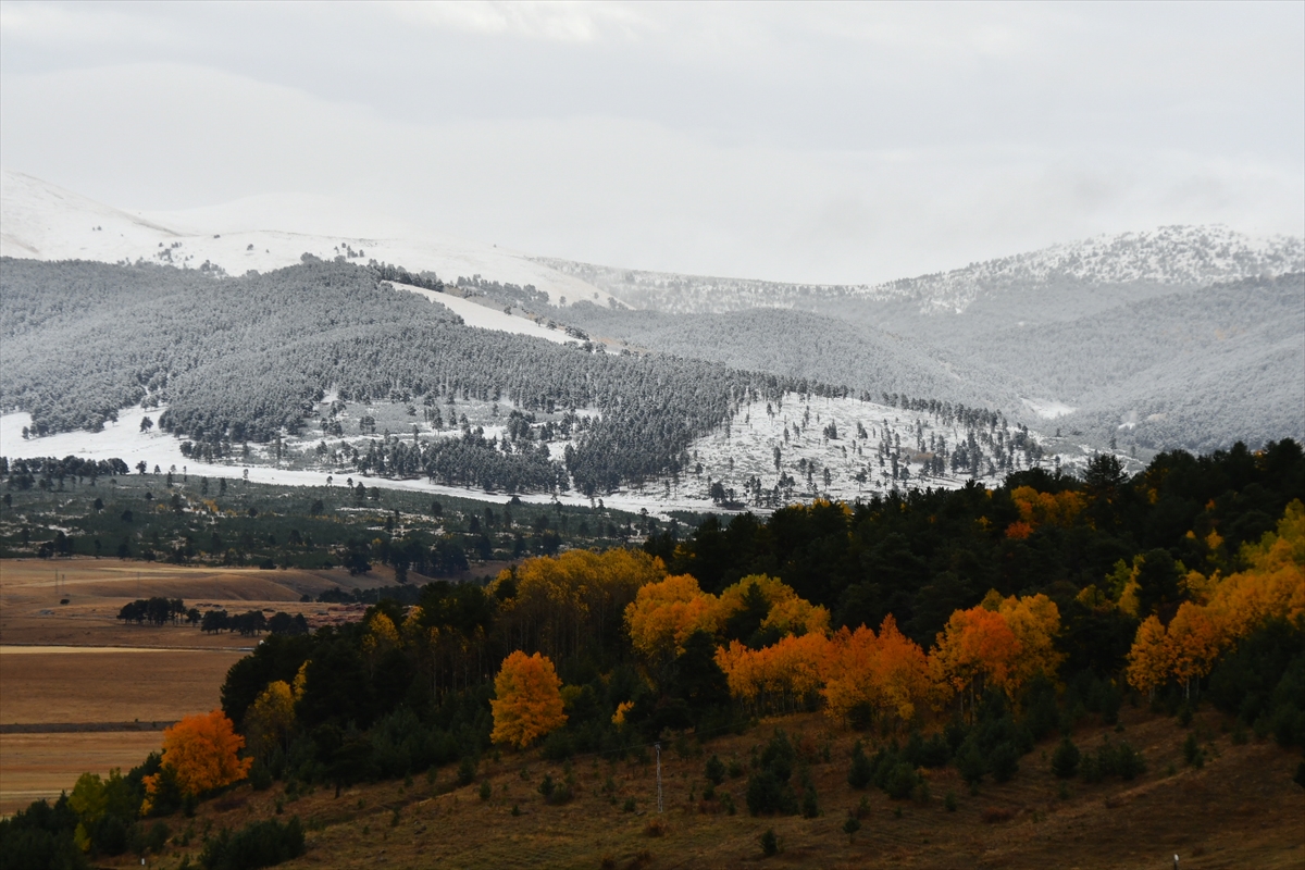 Yörede sonbaharın sarı ve kırmızı renklerine bürünen ağaçlarda kar yağışı ile güzel görüntüler oluştu.