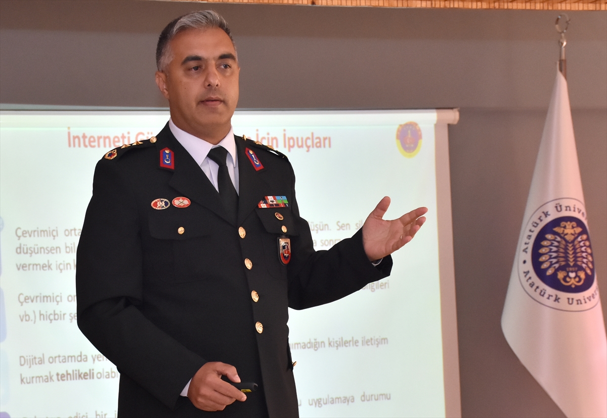 Eğitimler çerçevesinde Narman Meslek Yüksekokulundaki öğrencilere bir araya gelen jandarma personeli, uyuşturucuyla mücadele, kadına şiddet ve siber suçlarla yapılan dolandırıcılık konularında öğrencilere seminer verdi.