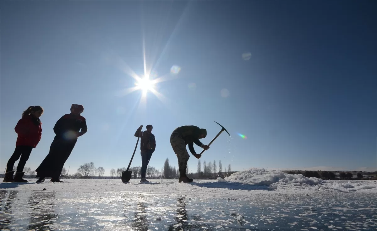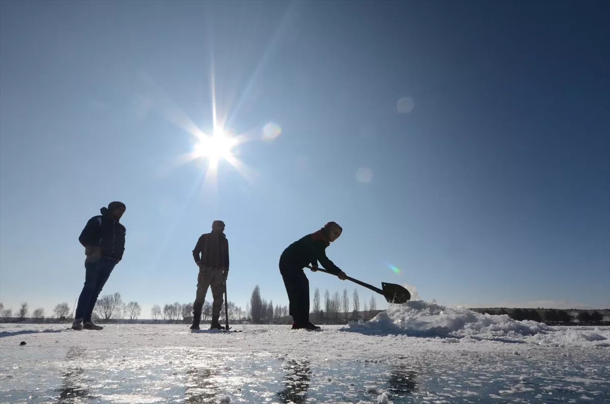 Kış aylarında yüzeyi tamamen donan, Doğu Anadolu'nun en büyük ikinci gölü Çıldır'da, bölgede etkili olan soğuk hava nedeniyle buzlar henüz erimedi.
