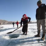Köyün kadın balıkçısı Kılıç, dondurucu soğukta eşi Turhan, oğulları Kurtuluş ve Yiğit ile buzla kaplı gölde balık avına çıkarak ekmeğinin peşinden koşuyor.