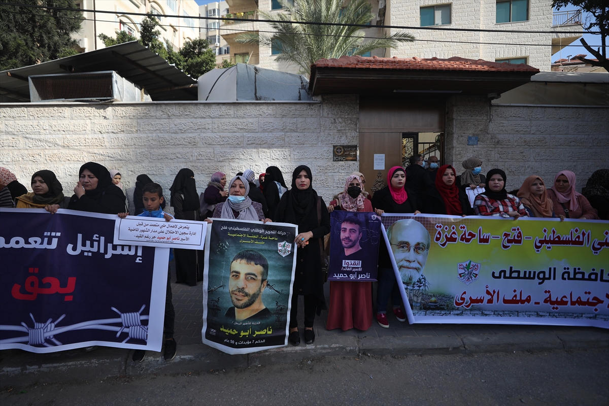 İslami Cihad Hareketine bağlı Muhce el-Kudüs ile Vaid Esirler ve Özgürlüğüne Kavuşanlar derneklerinin çağrısı üzerine Gazze'deki Uluslararası Kızılhaç Komitesi binası önünde toplanan göstericiler, İsrail hapishanelerindeki hasta Filistinli tutuklularla dayanışma mesajı verdi.