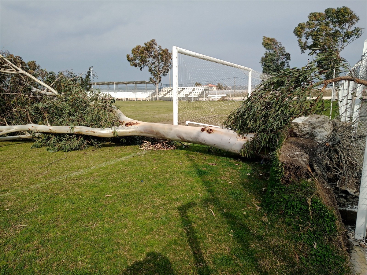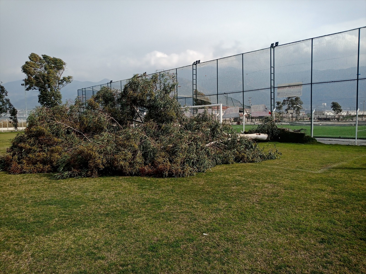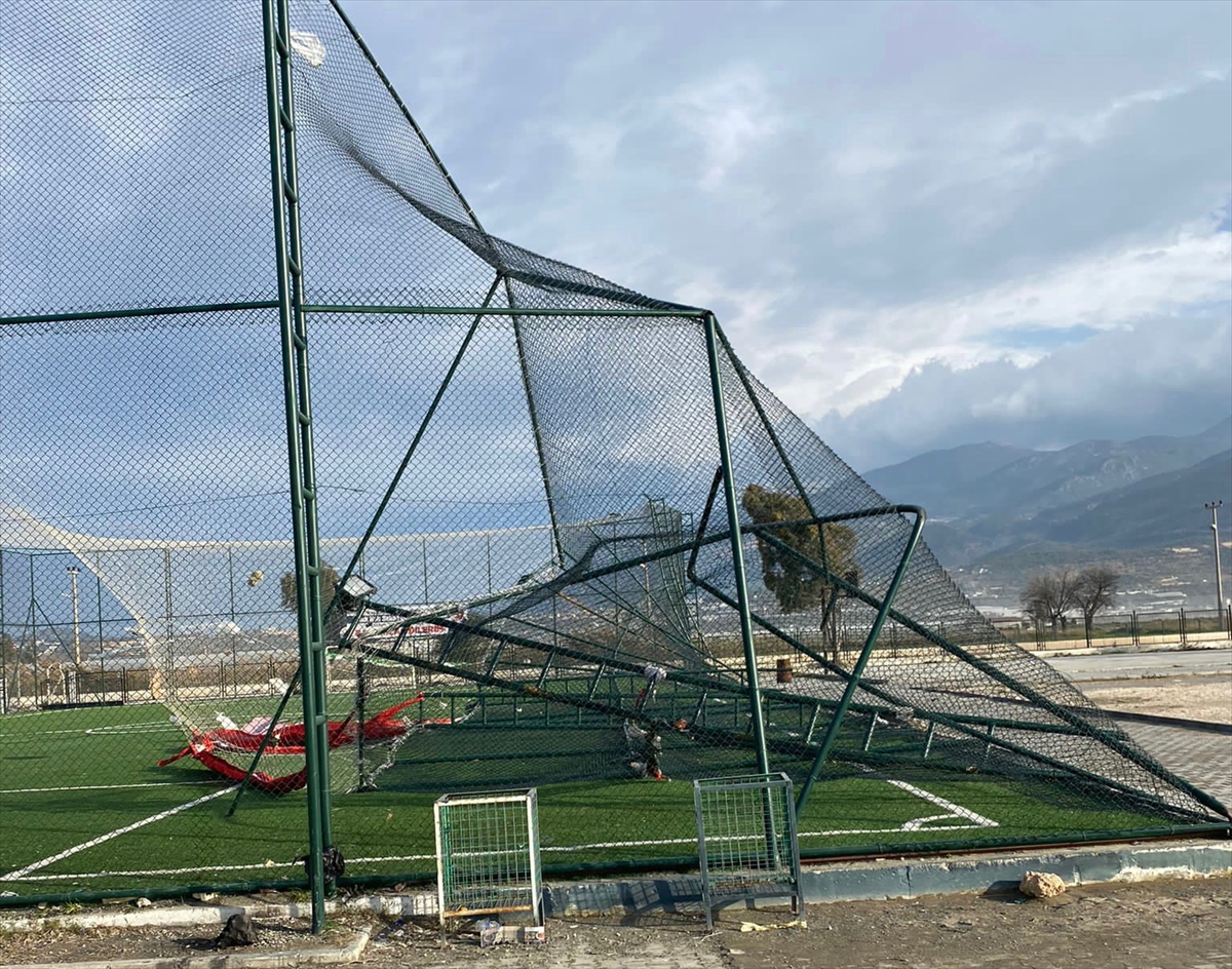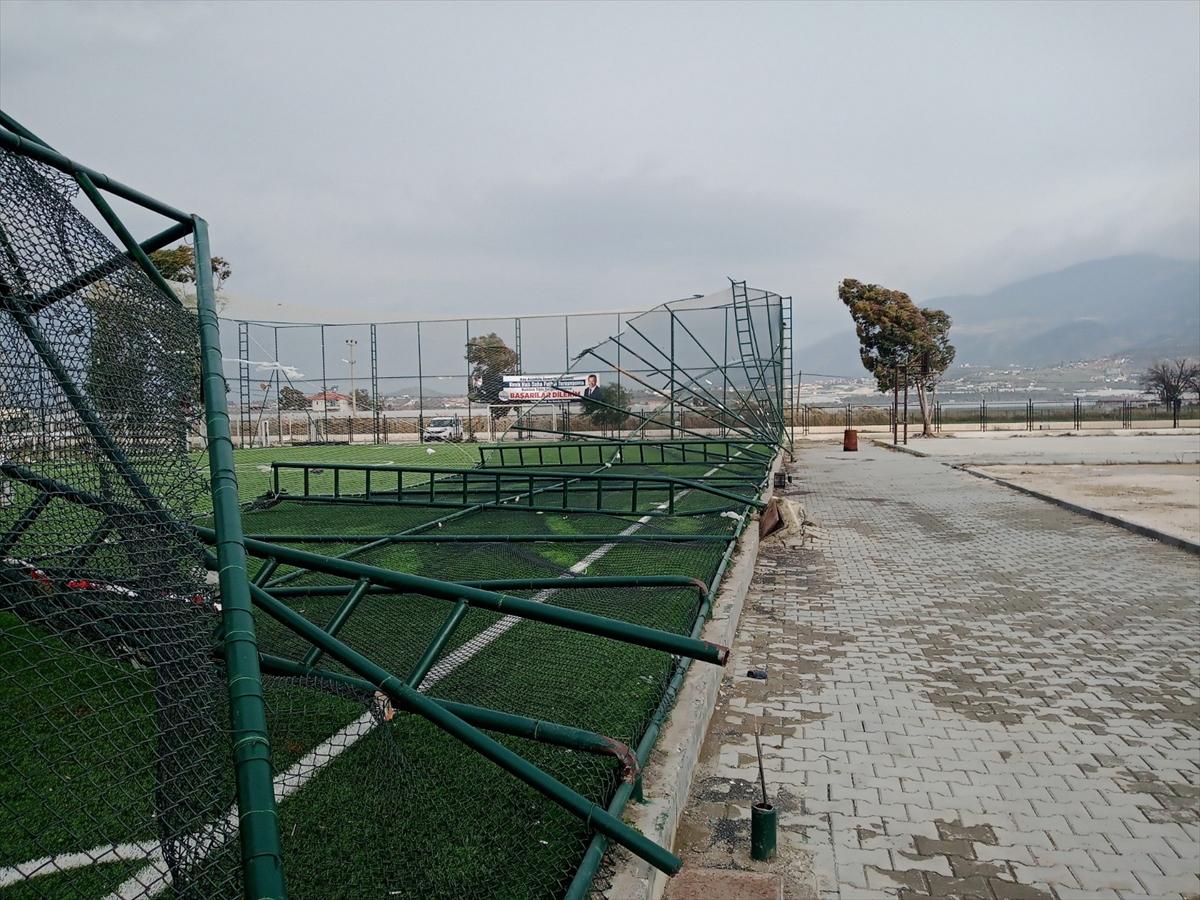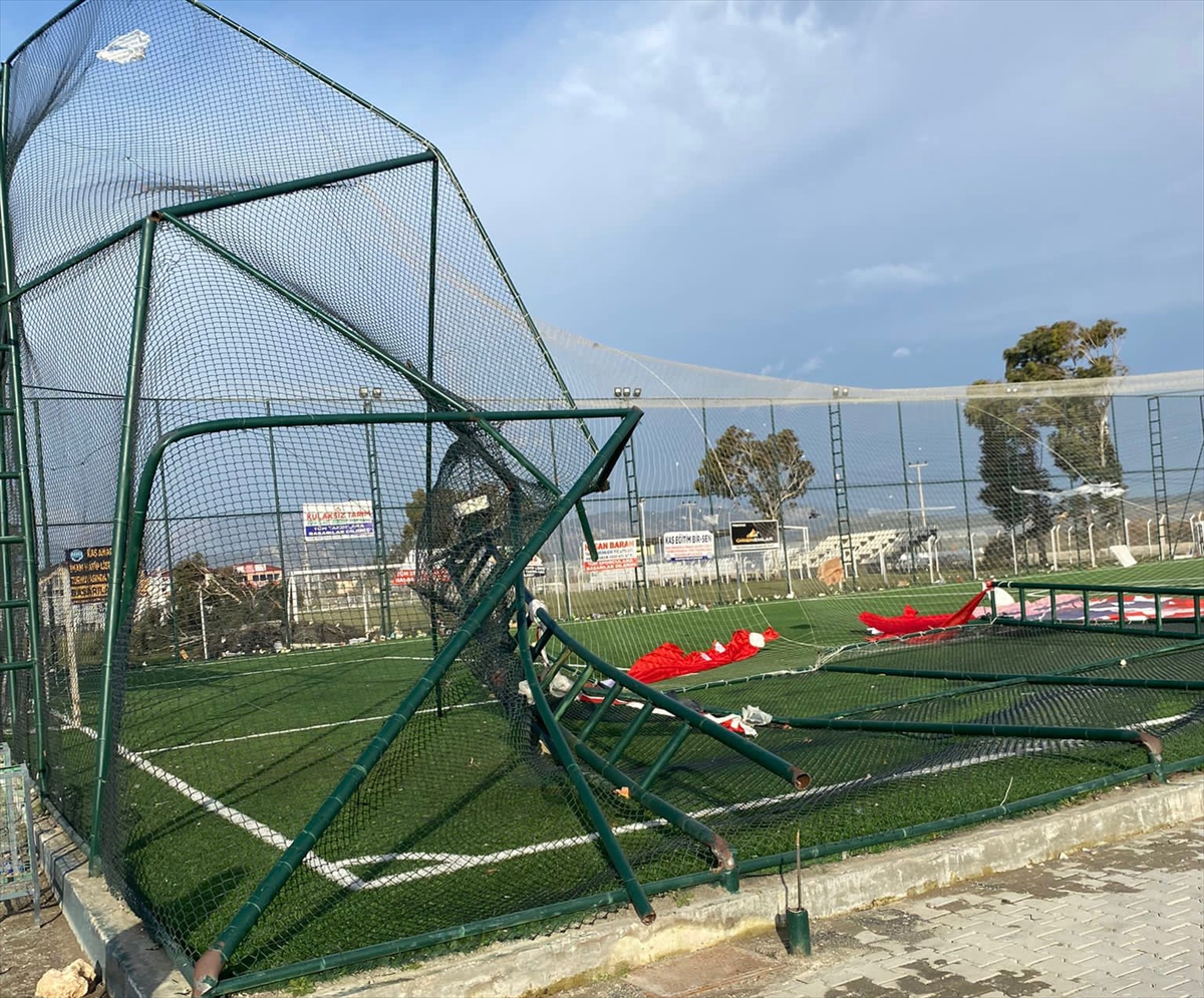 Futbol halı sahasına devrilen ağaç nedeniyle tel örgü duvar, kale direği ve saha zarar gördü.