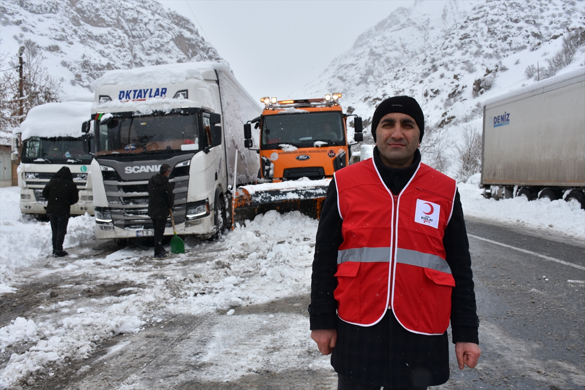 HAKKARİ (AA) – Hakkari'de Kızılay ve Afet ve Acil Durum (AFAD) İl Müdürlüğü ekipleri, Hakkari-Şırnak kara yolunun kardan kapanması nedeniyle yolda mahsur kalan tır sürücülerine yemek ve içecek ikram etti.