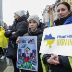 Başkentteki Ban Jelacic Meydanı'nda toplanan katılımcılar, Ukrayna bayrakları taşıyarak "Savaşa hayır", "Ukrayna'nın yanındayız" ve "Putin'e hayır" yazılı dövizler açtı.