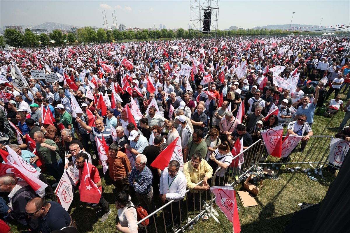 Maltepe etkinlik alanında yapılan mitingde, EYT yazılı dövizler taşıyan katılımcılar, emeklilikte yaşa takılanlar için gerekli düzenlemelerin yapılmasını isteyen sloganlar attı.