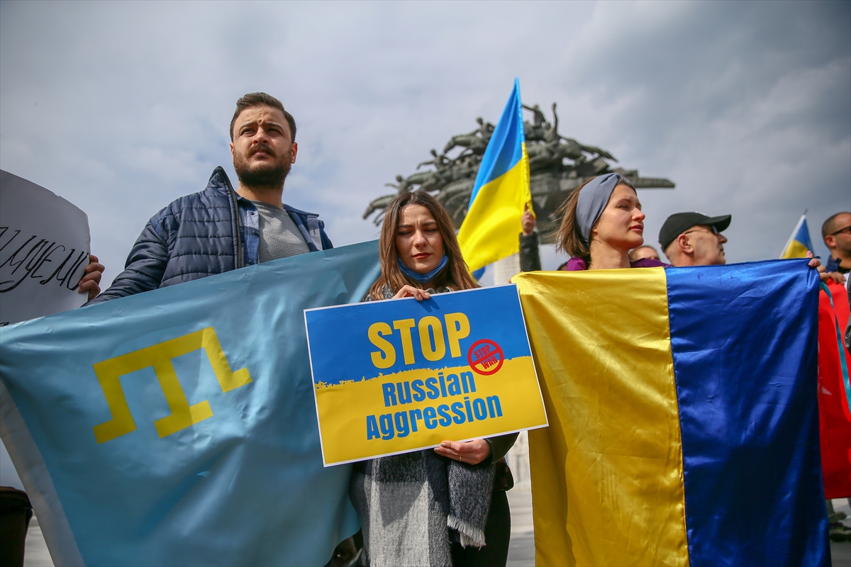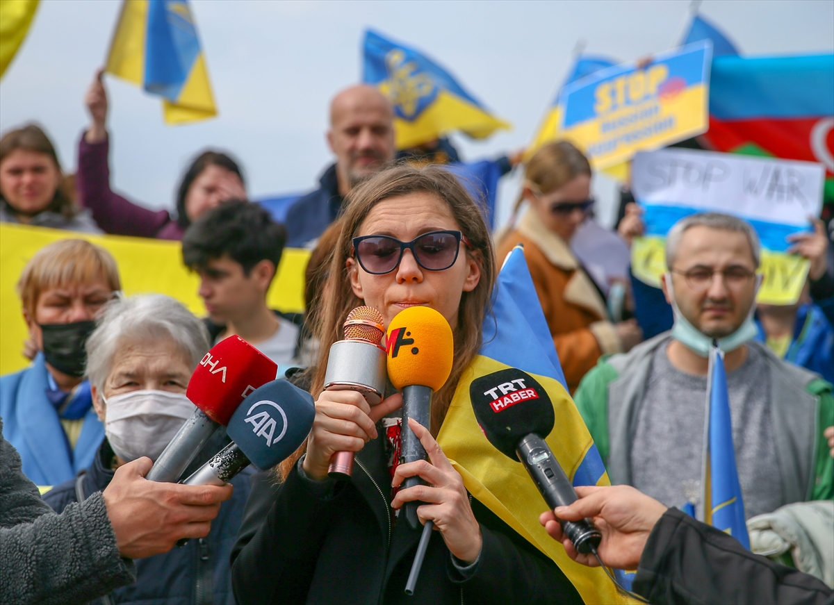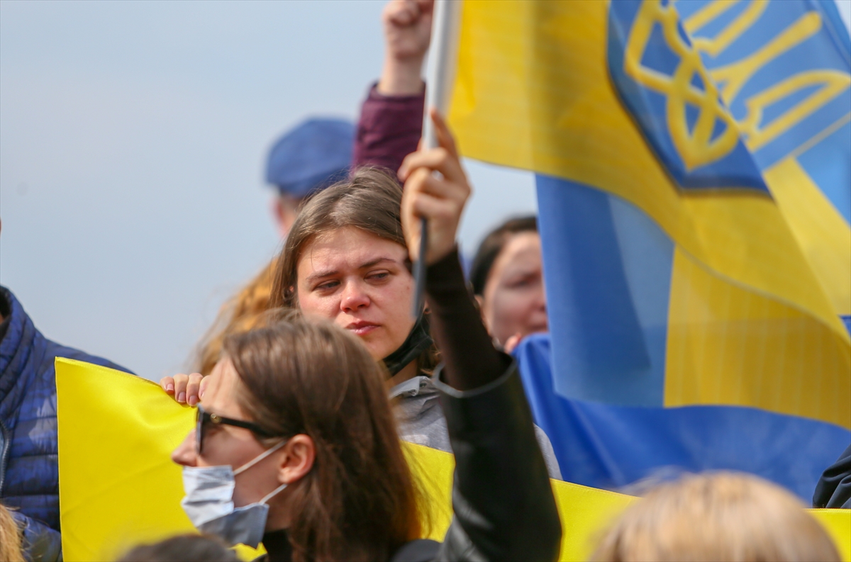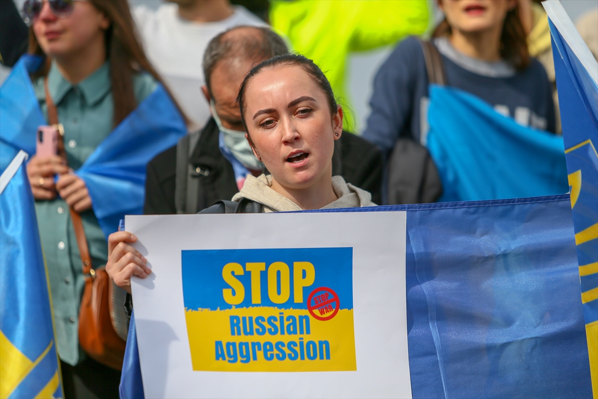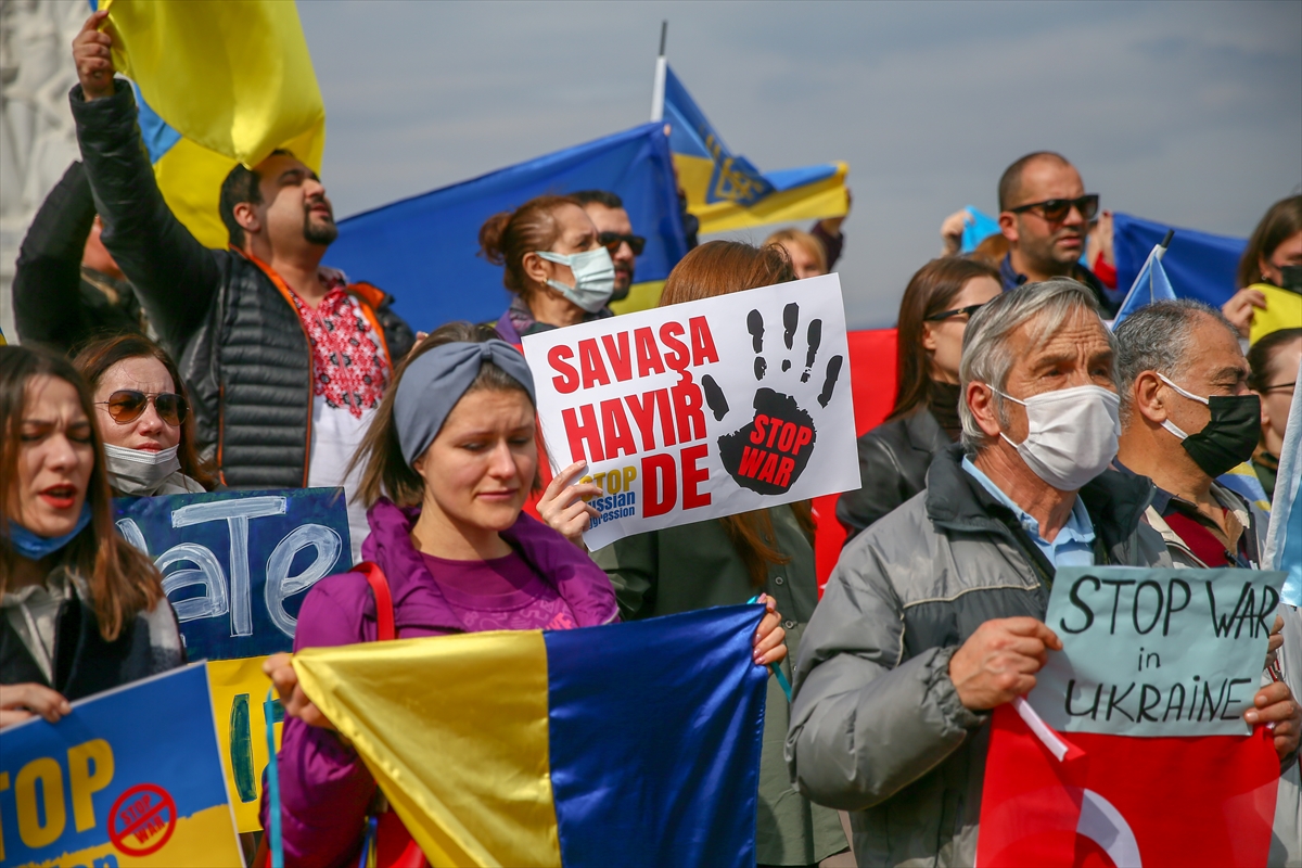 Türk ve Ukrayna bayrakları taşıyan grup, "Savaşa hayır", "Saldırıları durdur Rusya" pankartları açarak, Rusya aleyhine sloganlar attı.